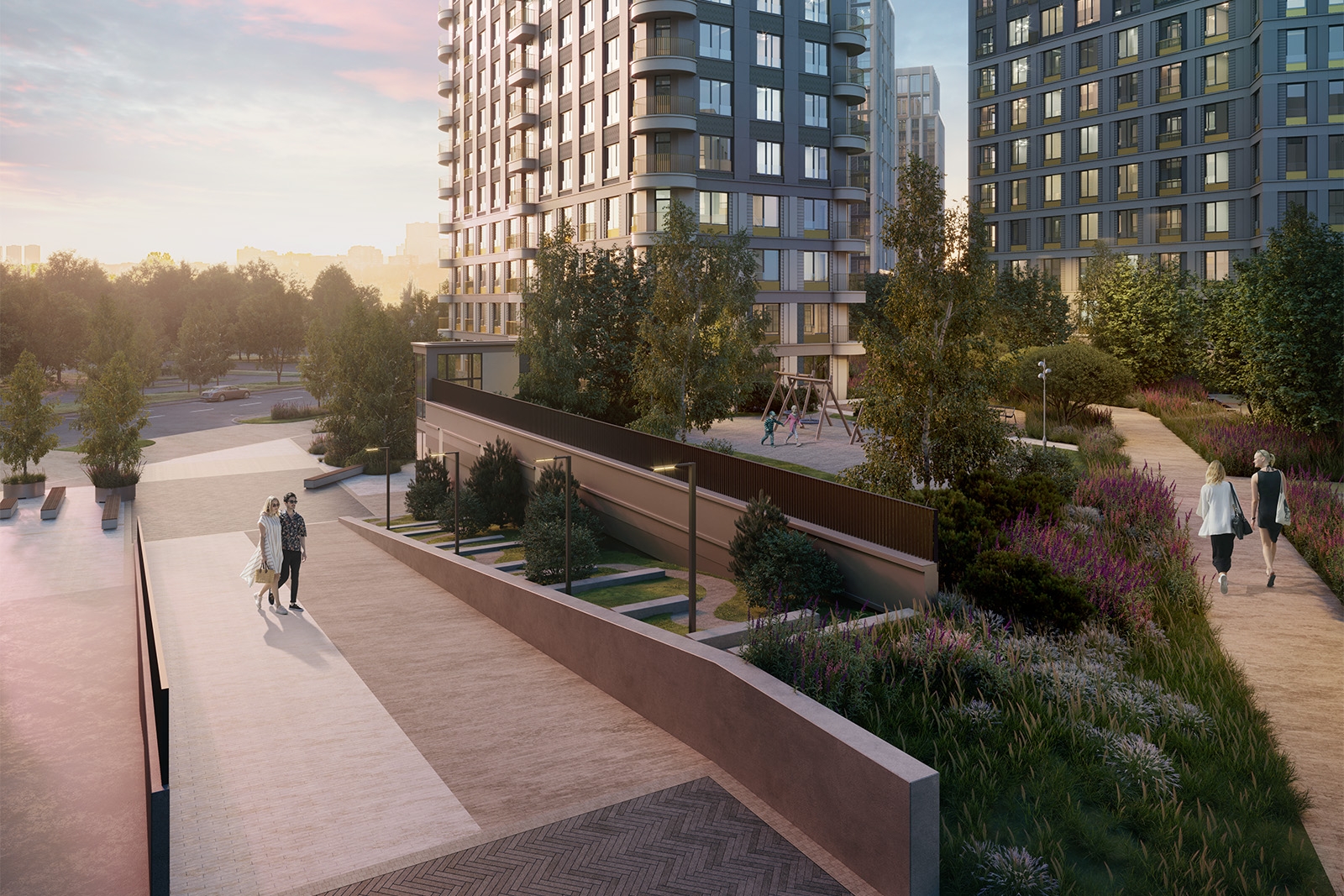 Разница в высоте между ярусами использована для устройства детских горок, а в центральной части между ними оборудован деревянный амфитеатр. На верхнем уровне предусмотрена широкая зона променада.
