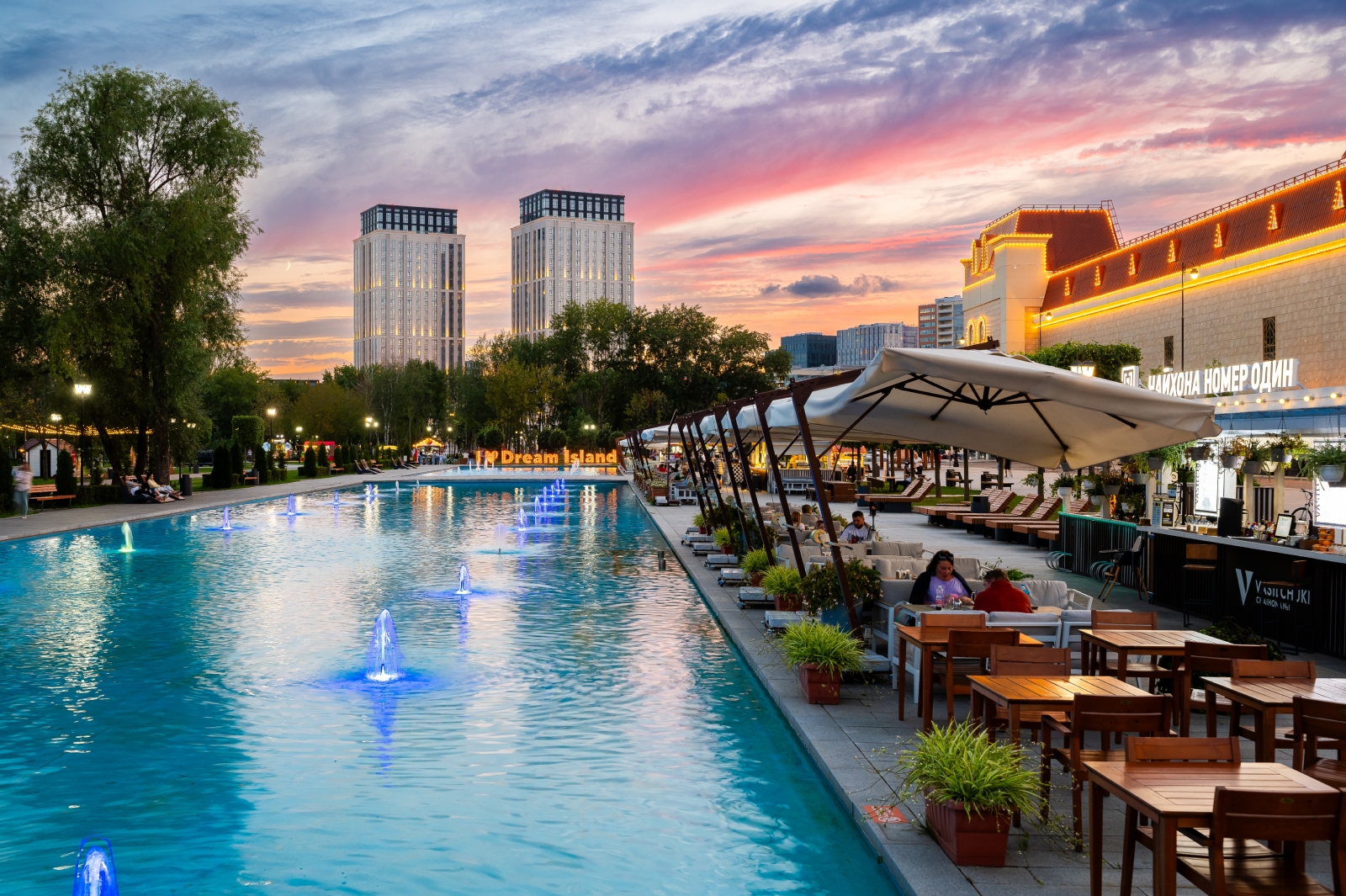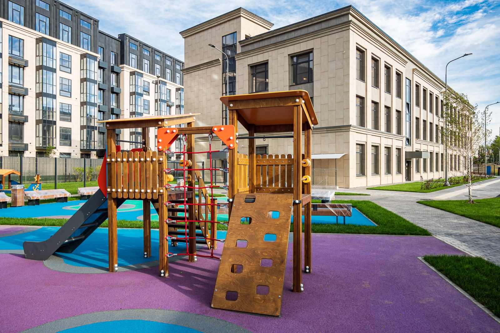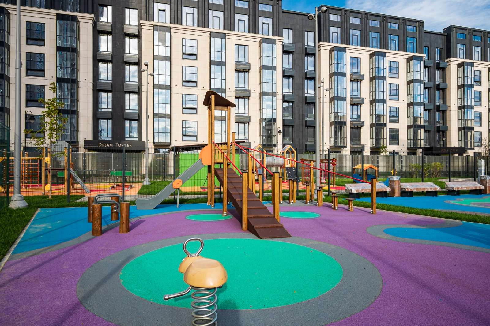Территория комплекса поделена на зоны для занятий спортом, игр и отдыха на свежем воздухе детей разных возрастных групп. Вместе с тем предусмотрены места для хранения велосипедов и санок. Объект возведен в составе ЖК Dream Tower.
