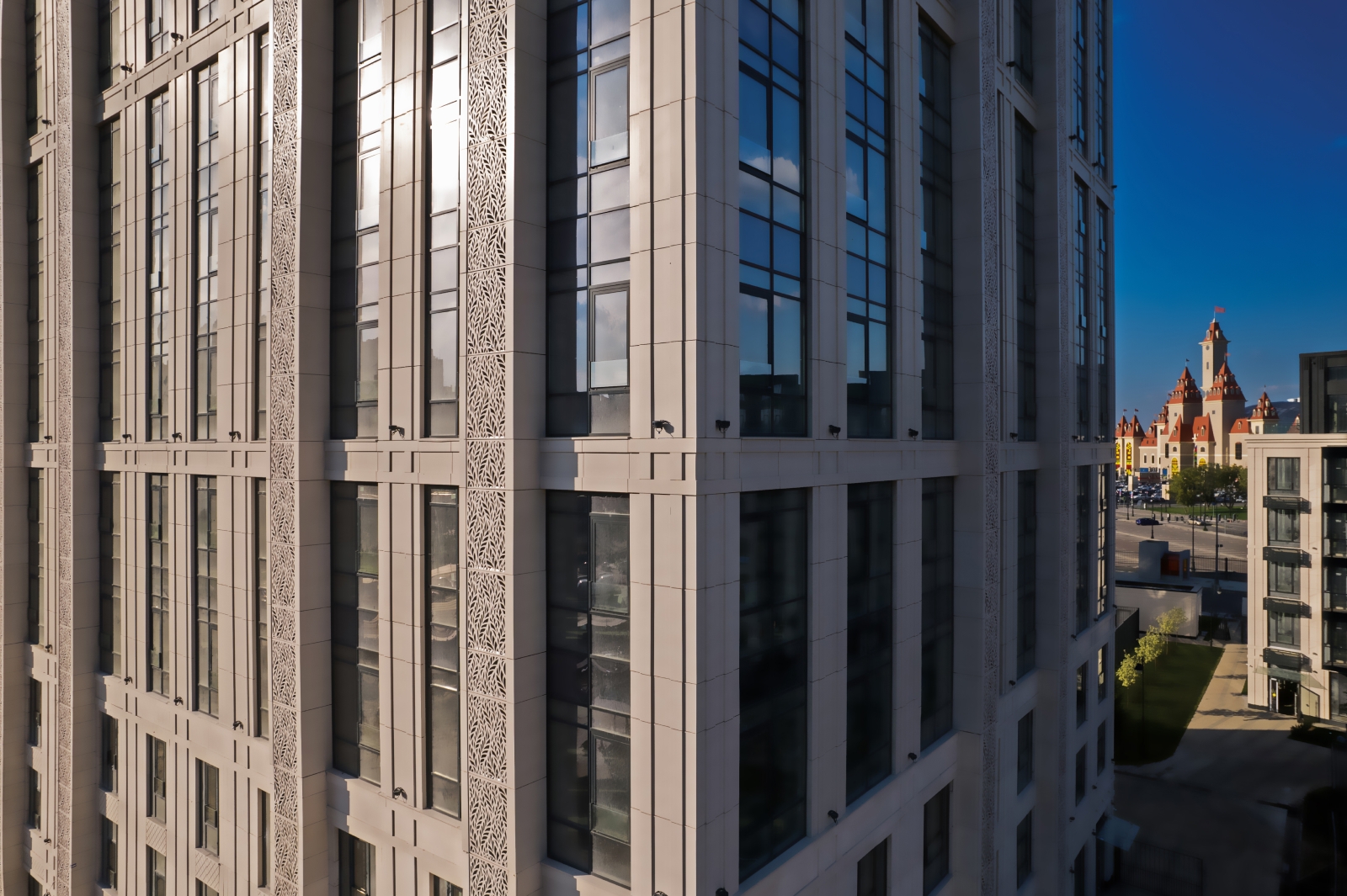 Фасады здания облицованы керамогранитом – натуральным материалом, сохраняющим тепло и отличающимся высокой твердостью и прочностью. Помещения оформлены в пастельных тонах, а в зонах, где дети проводят много времени, установлены витражные окна, обеспечивающие естественное освещение.