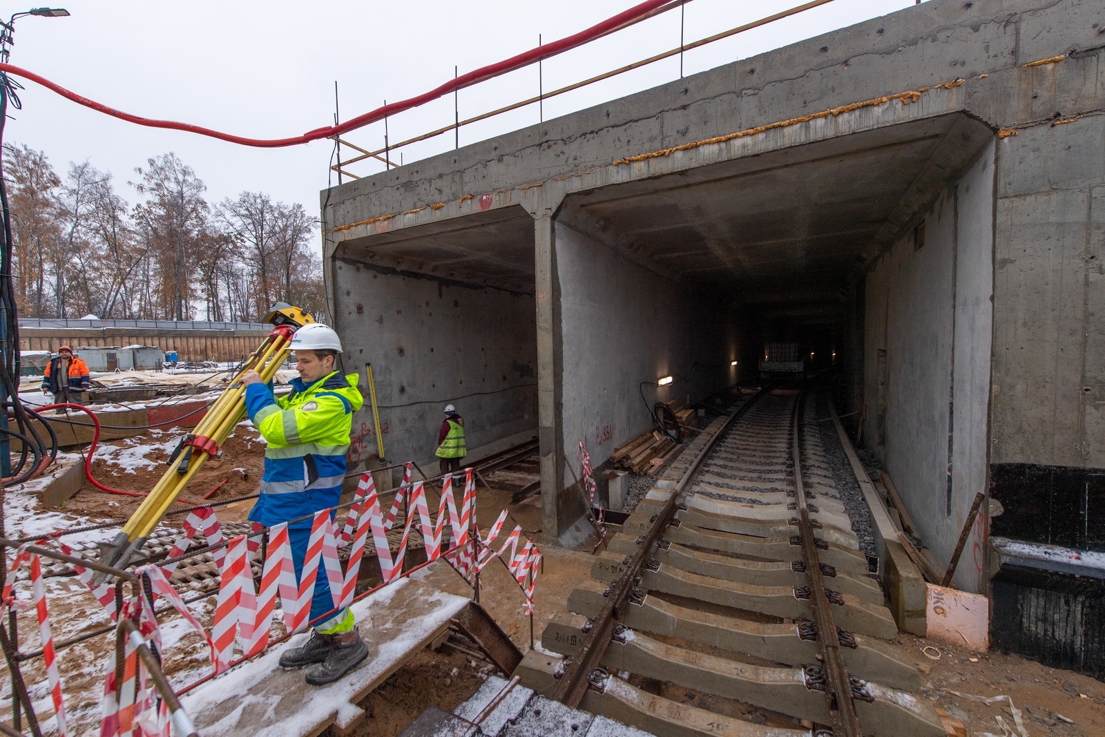 Для перегона составов Сокольнической линии подземки сооружаются три соединительные ветки, по которым уже завершаются монолитные работы, на одной из них начат монтаж верхнего строения пути.