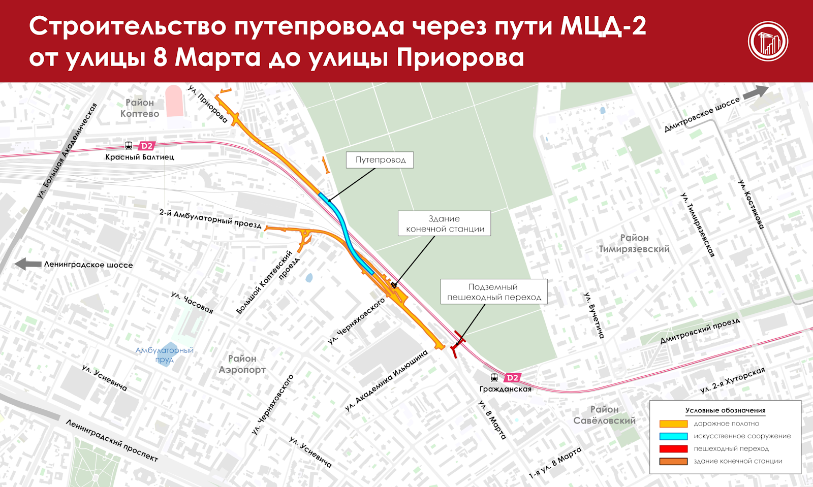В створе ул. Академика Ильюшина появится подземный переход длиной 70 м, который обеспечит безопасный доступ пешеходов к Тимирязевскому парку и станции МЦД-2 Гражданская.