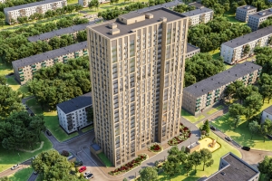 Окружающая территория благоустроена: здесь оборудованы велопарковка и современная детская площадка, высажены газоны, кустарники и деревья.