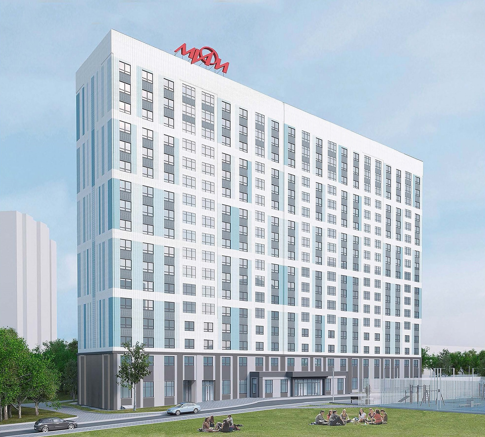 Для них построили двухсекционный 17-этажный дом, фасад которого оформили в фирменных светло-голубых тонах МИФИ. В благоустроенном дворе общежития расположились площадки для отдыха и занятий физкультурой, а также велопарковка.