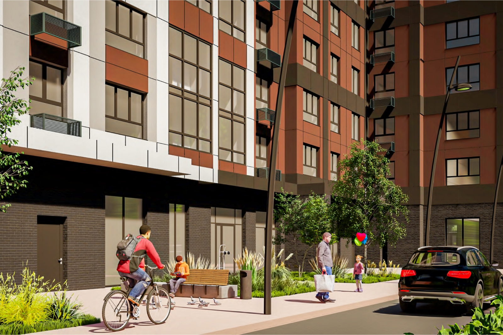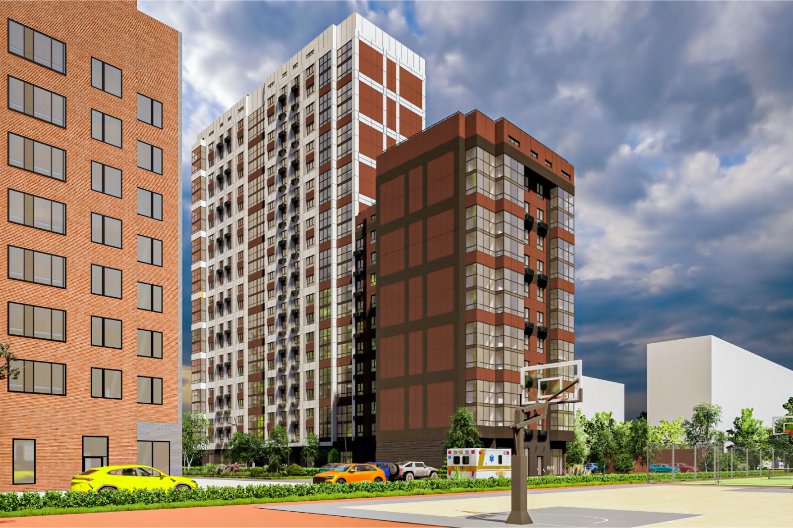 Придомовую территорию благоустроят и озеленят: высадят деревья и кустарники, разобьют газоны и цветники, обустроят детскую площадку с безопасным резиновым покрытием, спортивную площадку, а также зону для тихого отдыха.