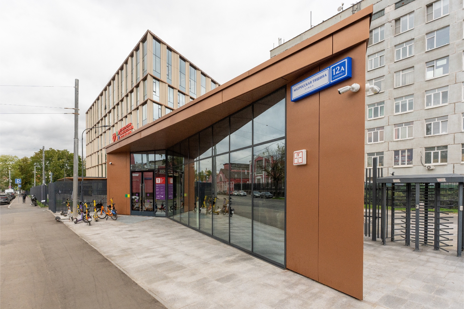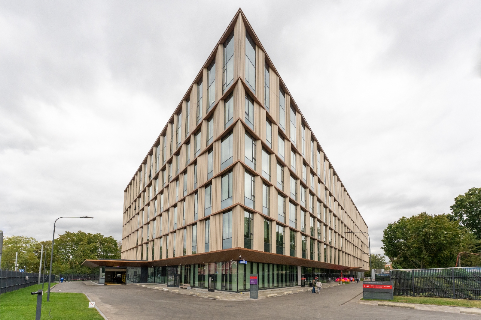 Здание имеет диагональный фасад вдоль ул. Матросская Тишина. Первый этаж выполнен из витражных конструкций. Фасадные рустованные пилоны сделаны из алюминия и окрашены под натуральный камень.