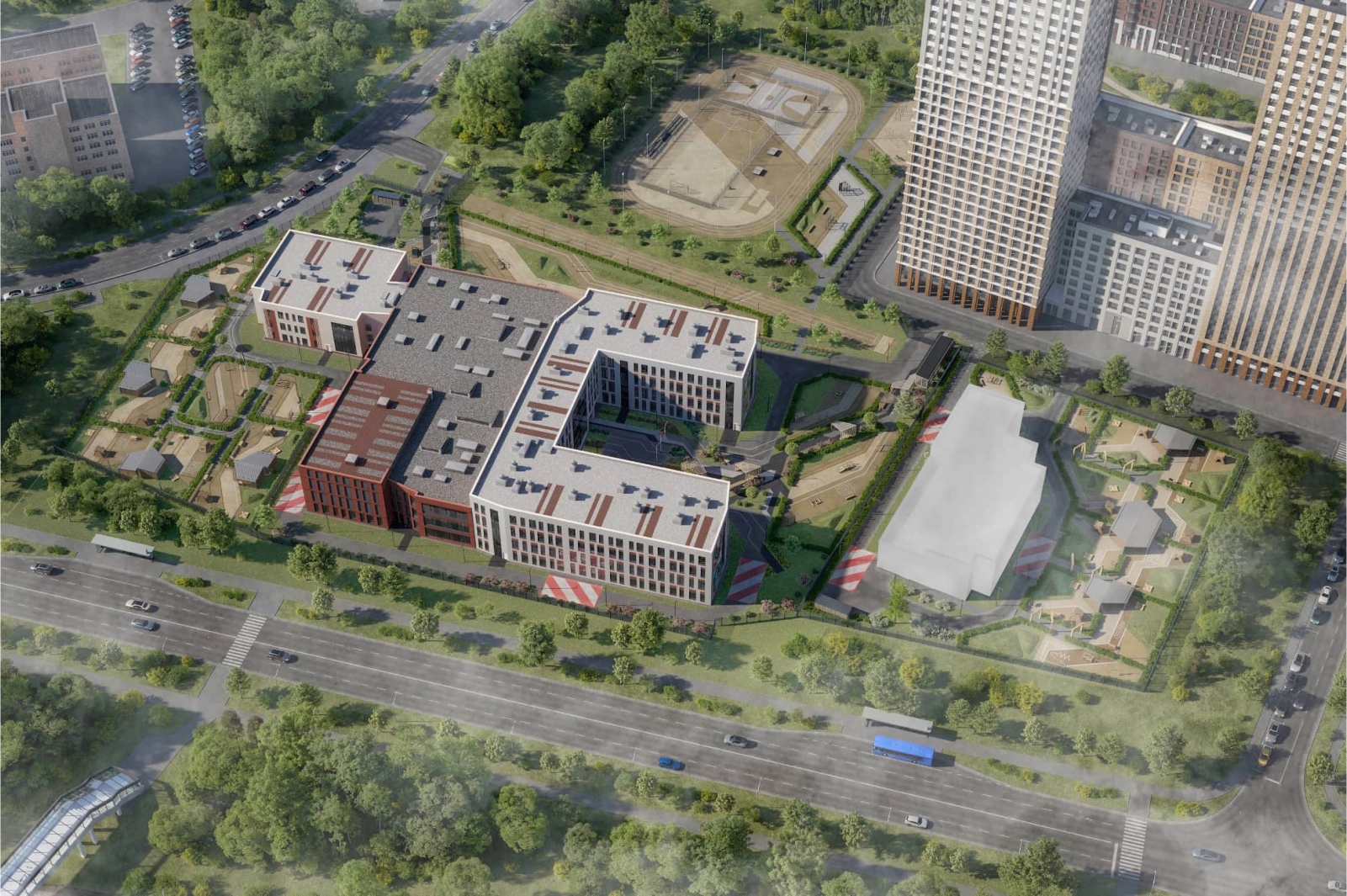 В школьной части комплекса появятся гимнастический, два спортивных и два актовых зала на 200 мест каждый. Для учащихся начальных классов запроектирована игровая комната с возможностью организации спальных мест.