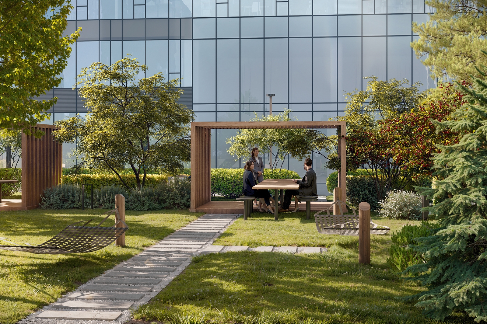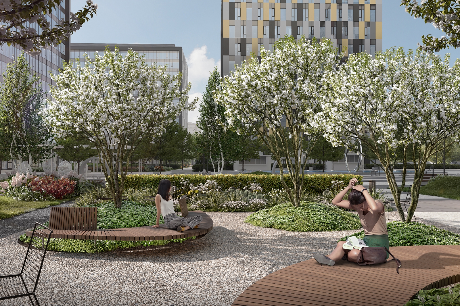 «Здесь разместится центральная площадь для проведения мероприятий, «зеленые кабинеты» для работы на свежем воздухе, площадки для занятий спортом и отдыха. Уличные коворкинги оборудуют столами с высокими стульями в тени деревьев, для неформального общения создадут зоны с небольшими садами, где установят уличные шезлонги, гамаки, а также беседки с настилами из лиственницы и качели-коконы», – сказал Владислав Овчинский.