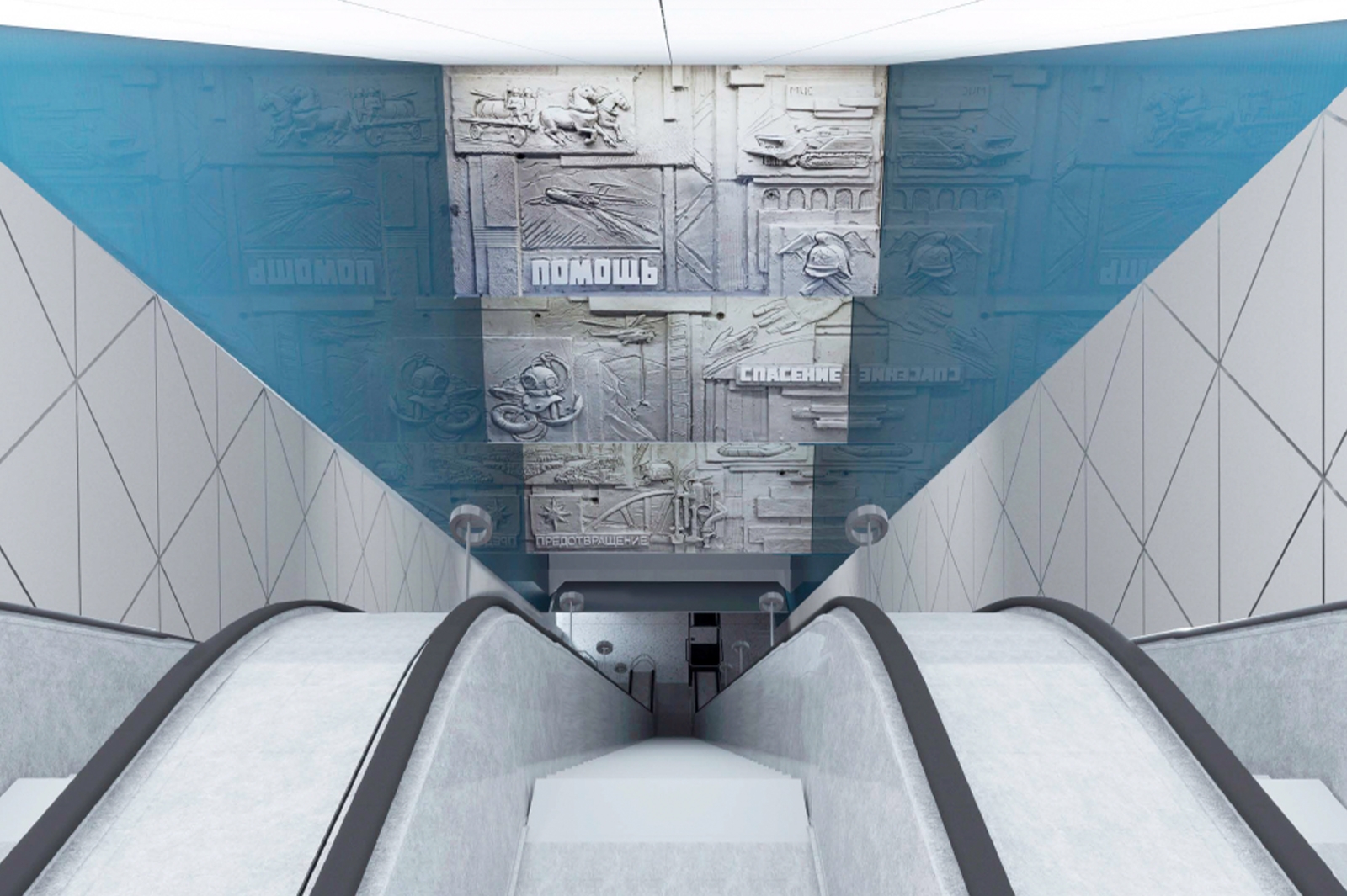 В эскалаторной зоне на потолке также будет несколько художественных композиций, где прописан девиз МЧС: предотвращение, спасение, помощь. Для отделки архитекторы предлагают использовать архитектурный бетон с мозаичными вставками из натурального камня и смальты.