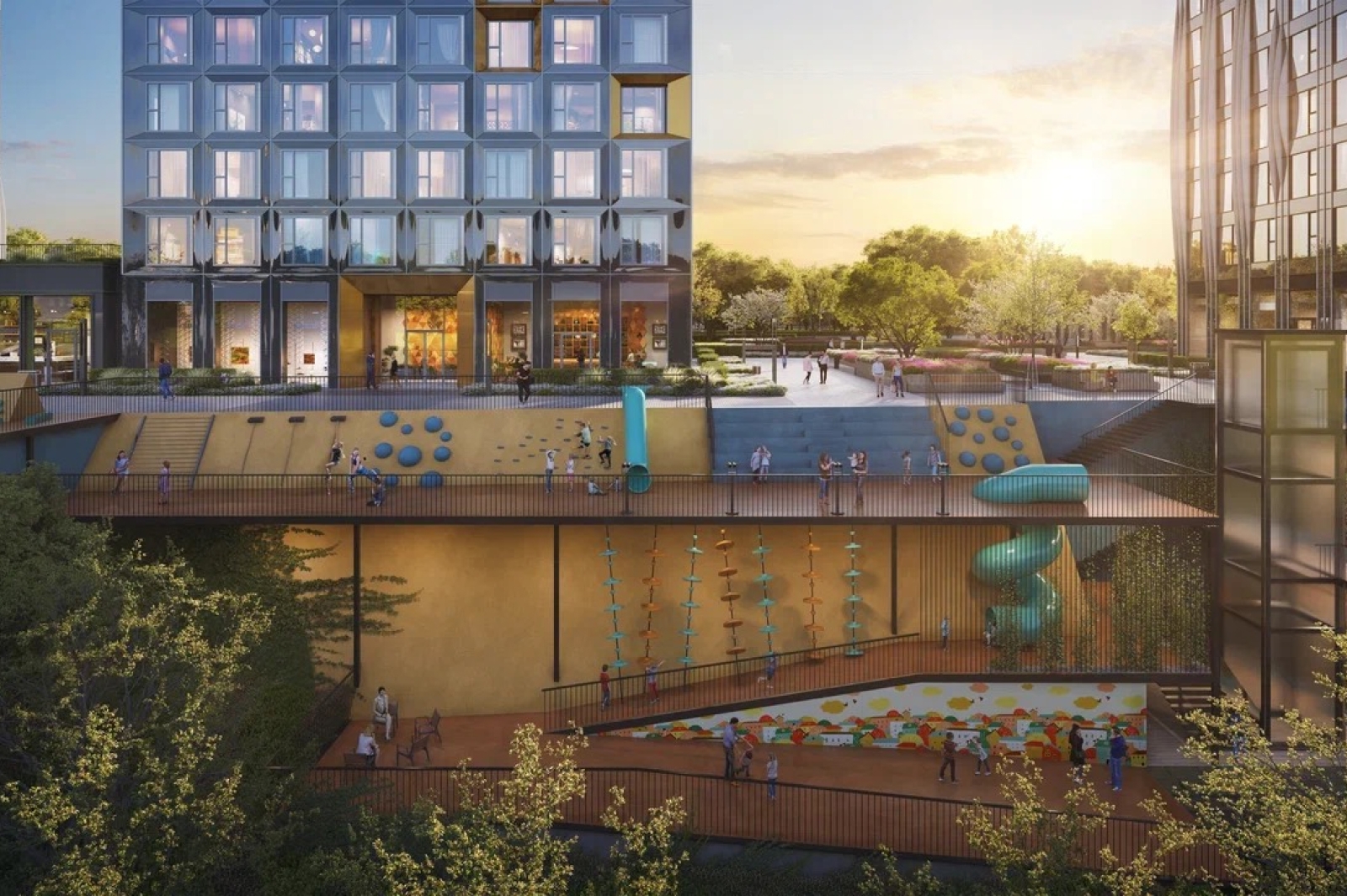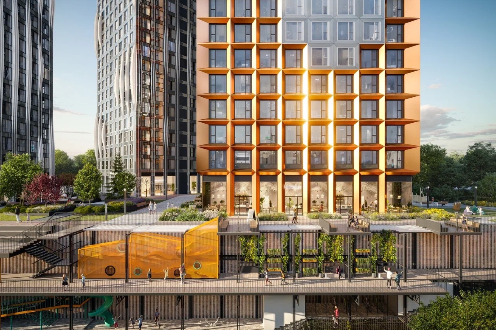 Двор жилого комплекса охватит 13 корпусов, расположенных вдоль заказника «Долина реки Очаковки». Ландшафт территории позволяет разместить уникальное сооружение – вертикальную досуговую площадку длиной 128 м и шириной 3 м.