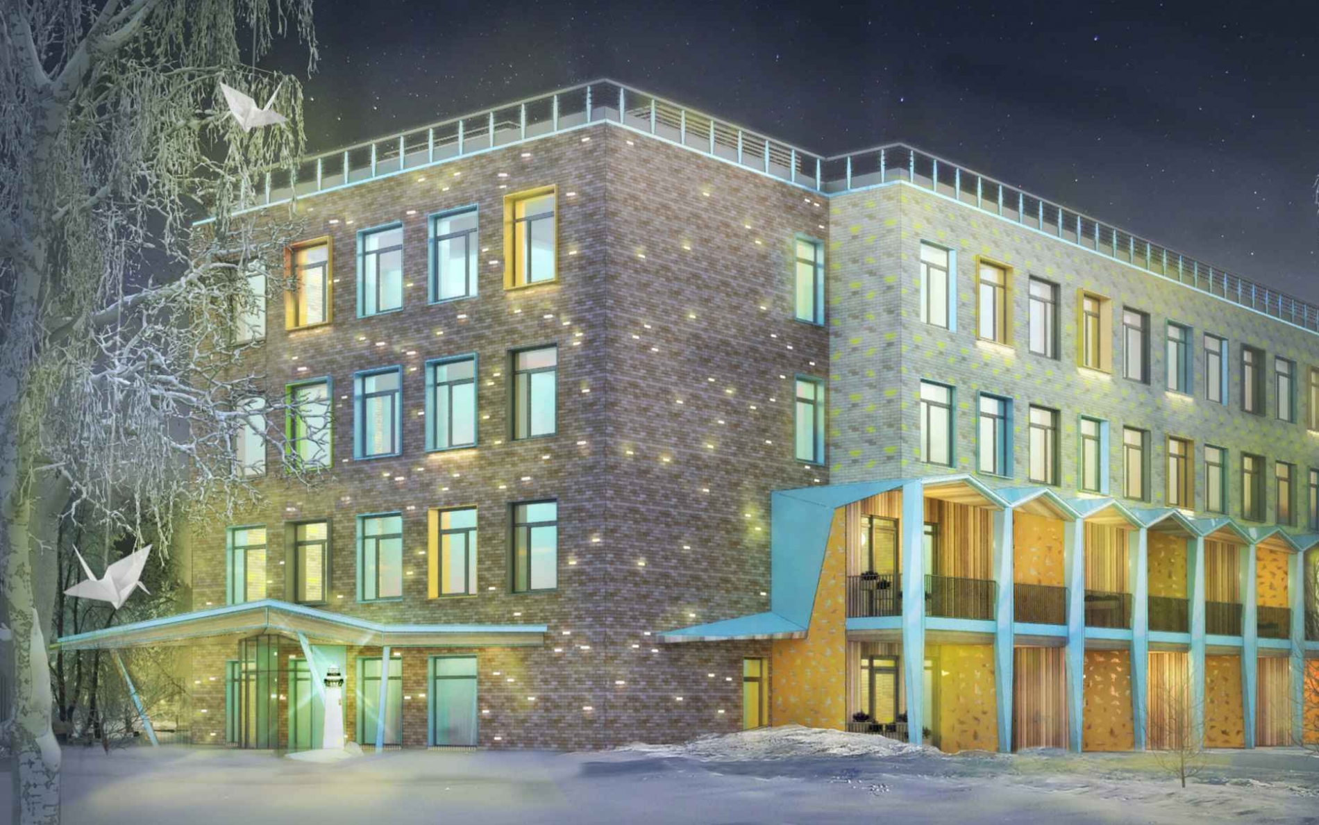 «Красочное оформление фасада, пластика архитектурных элементов, напоминающих оригами, оригинальные скульптуры в саду и светильники, встроенные в кирпичную кладку фасада, которые горят только ночью, символизируют свет и тепло причастных к хоспису людей. Для фасадов выбраны яркие и насыщенные оттенки цвета. Обрамление окон стилизовано под яркие кусочки бумаги, как символ разных характеров и судеб», - добавил С. Кузнецов.