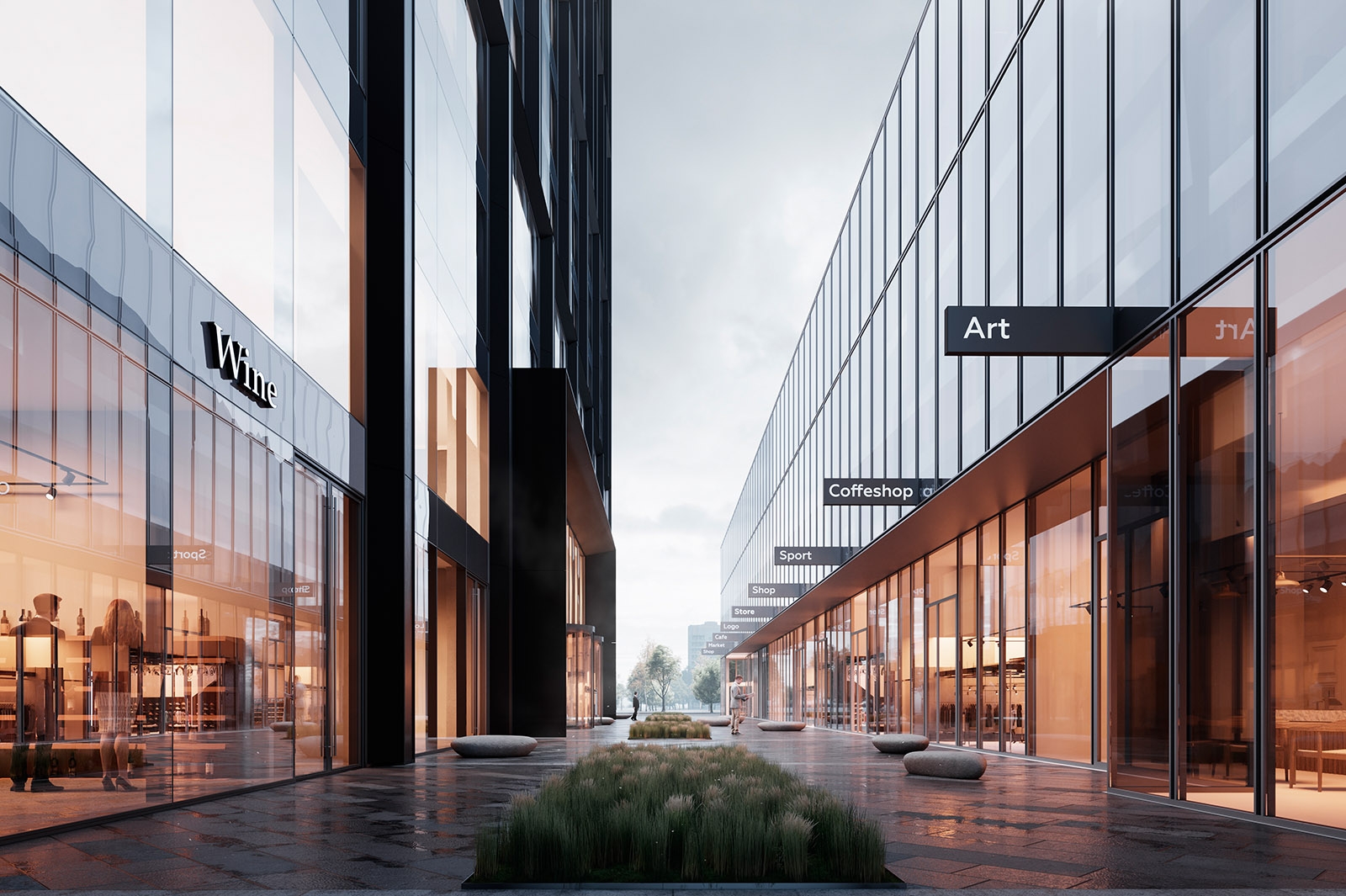 Проектом запланировано благоустройство общегородского пространства и строительство подземного паркинга. Так, между бизнес-центром и торговой галереей появится открытый пешеходный бульвар, формирующий коридор ритейла, который станет точкой притяжения для жителей всего района.