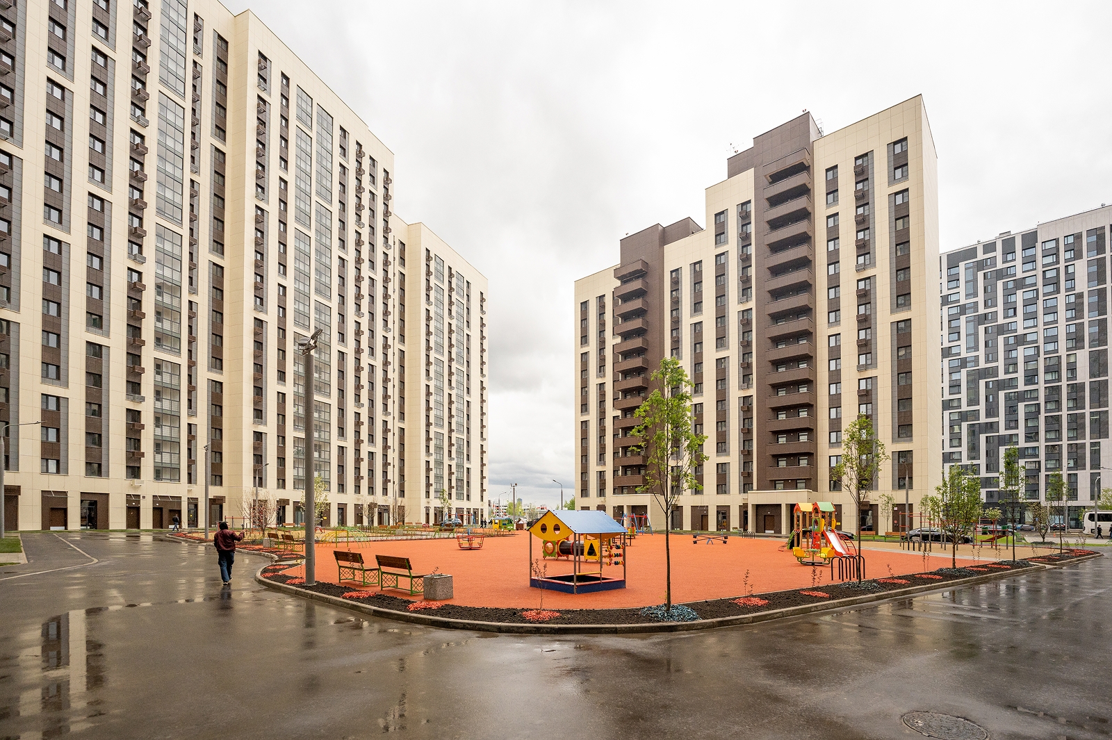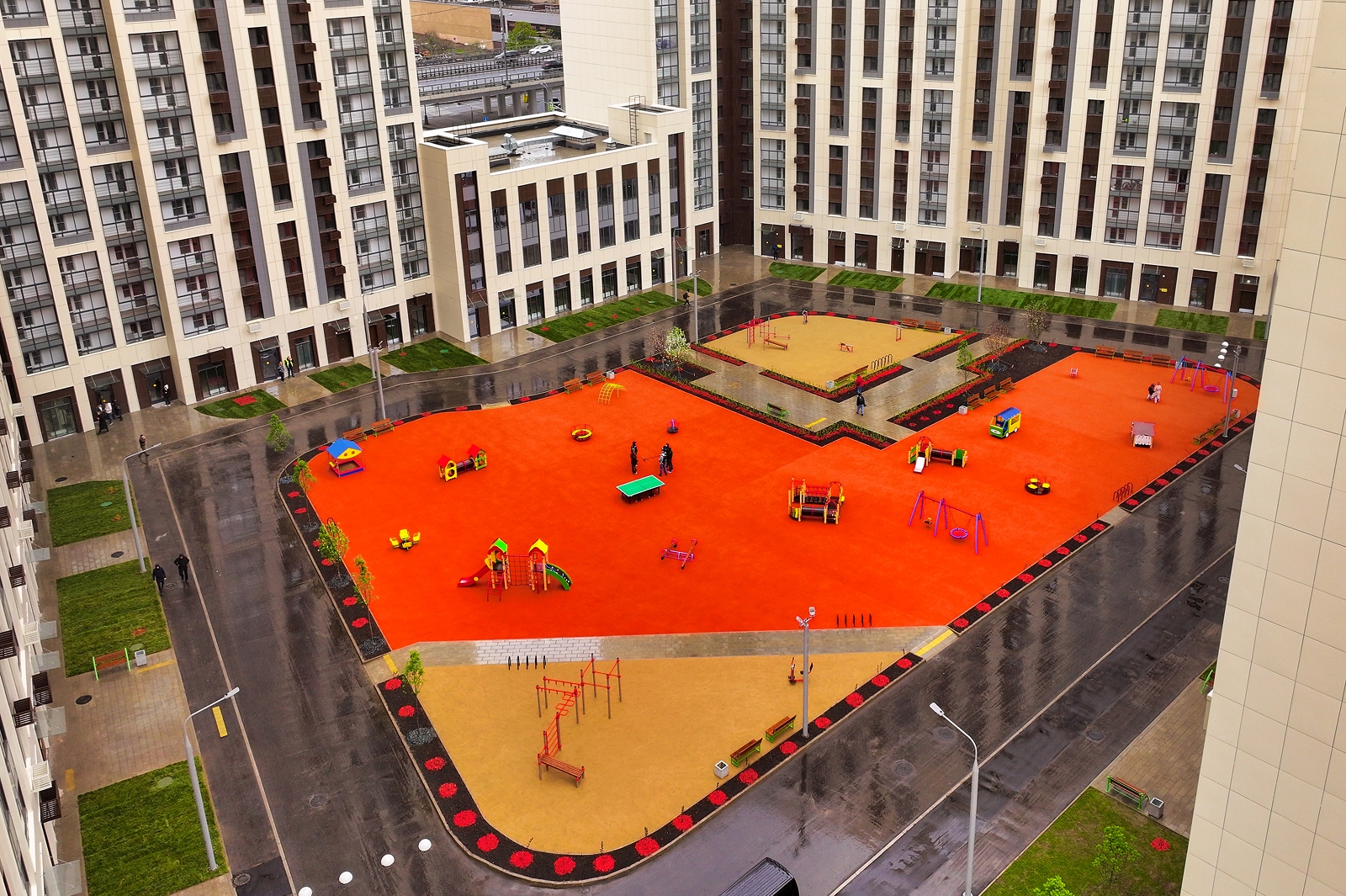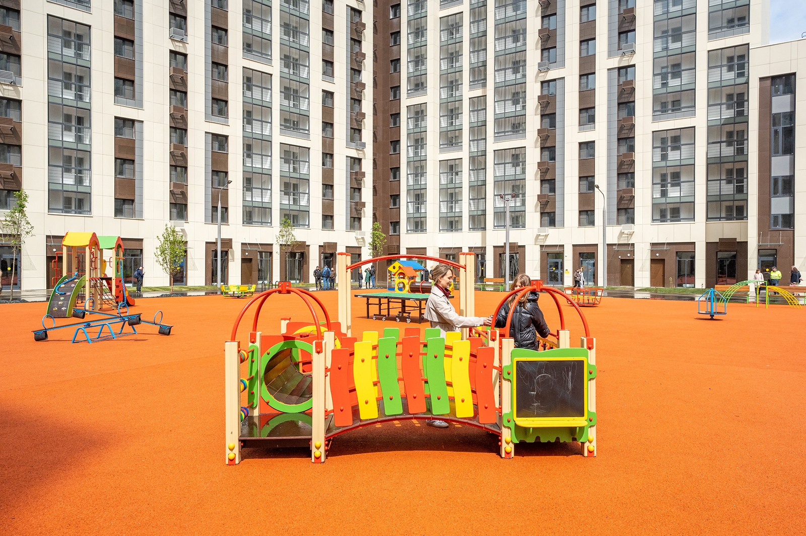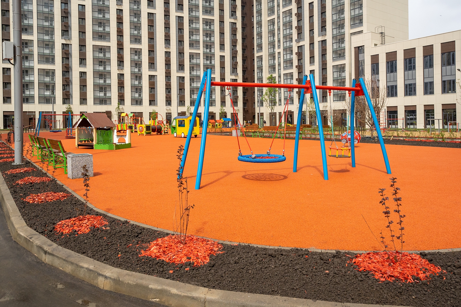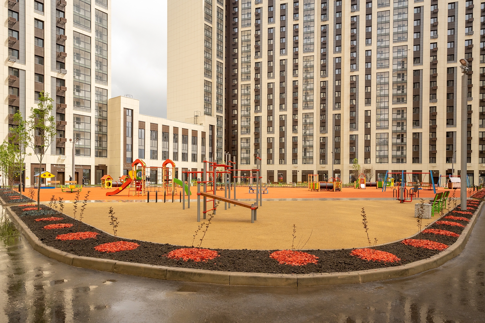 Территории возле современных жилых комплексов благоустроены: там высажены деревья и кустарники, обустроены газоны и цветники, оборудованы детские и спортивные площадки для досуга горожан.