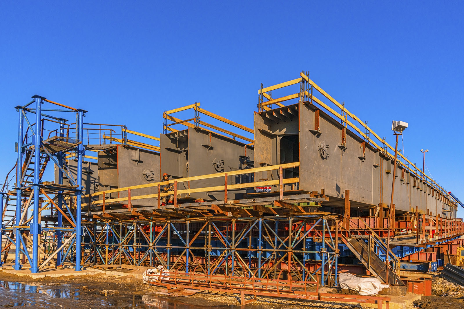 «Готовность моста составляет 46%. Завершается возведение опор, на стапеле ведется укрупнительная сборка пролетного строения: эти работы выполнены на треть, смонтировано 1360 из 4000 тонн металла. К надвижке пролетного строения планируется приступить в конце весны», – сказал Юрий Кравцов.