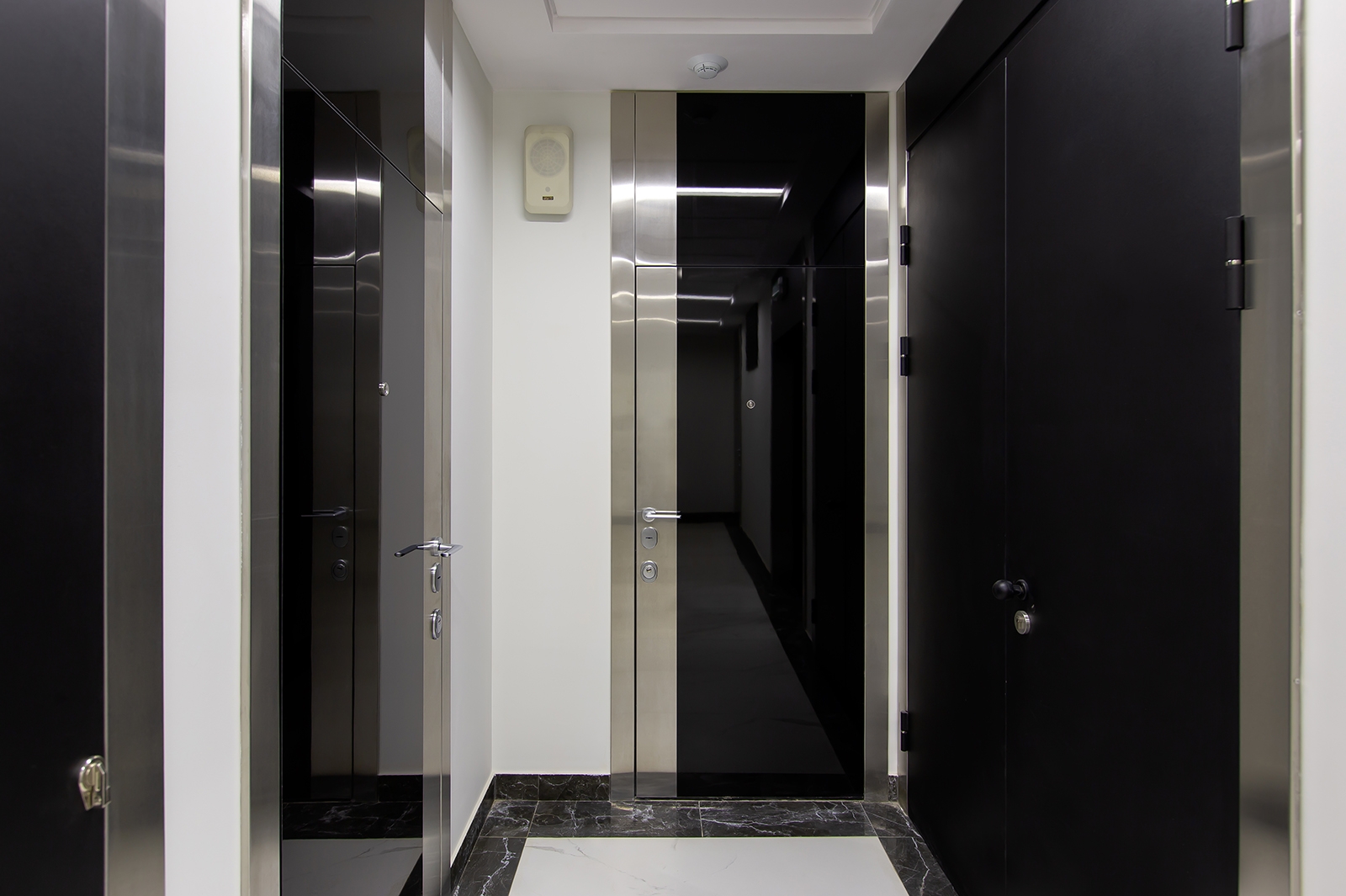 Входные группы выполнены по авторскому дизайн-проекту. В отделке применяются два вида керамогранита. Лобби украшают светильники и люстры. При входе в каждую жилую секцию установлена домофонная система.