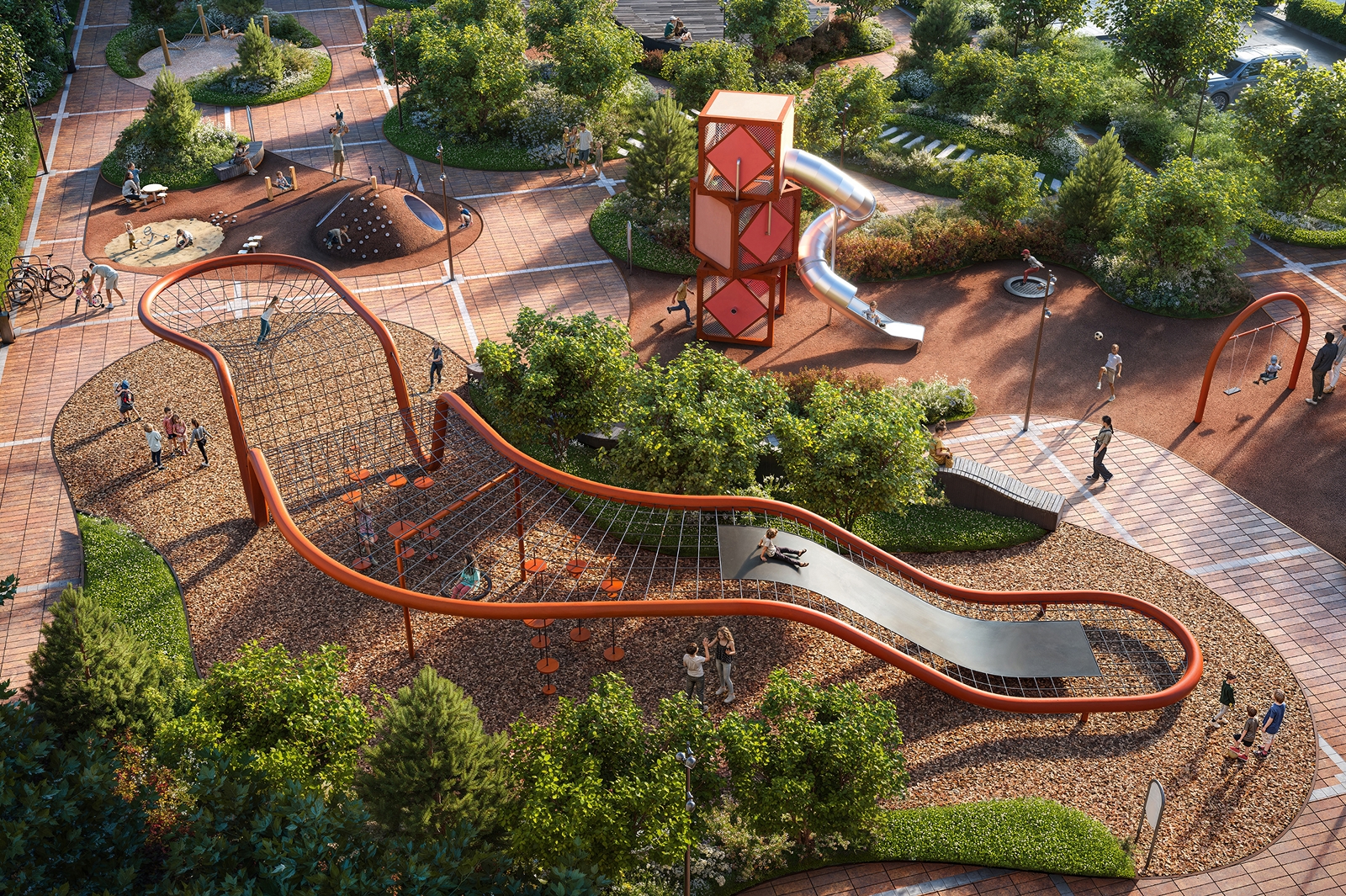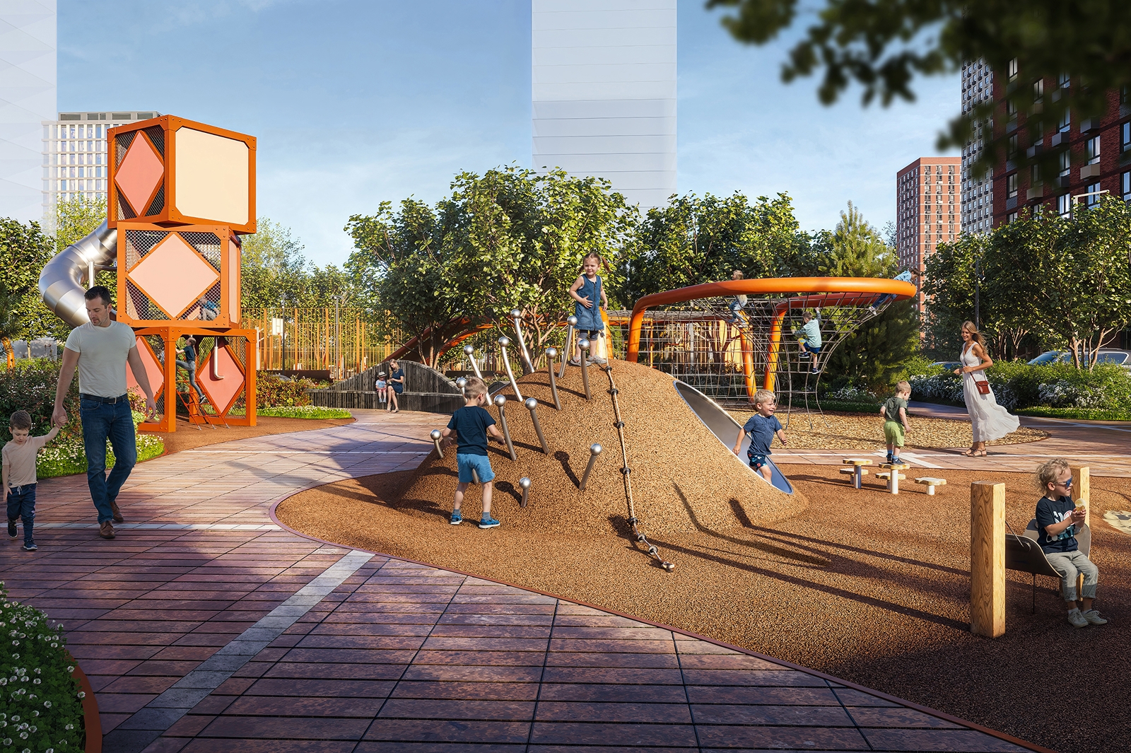 Для ребят постарше девелопер установит трехэтажный игровой комплекс с большой горкой, качелями и батутами. Здесь обустроят канатный комплекс длиной более 20 м с большой сеткой-паутиной, горкой и качелью-гнездом. В игровой зоне установят скамейки, где взрослые смогут отдыхать и наблюдать за своими детьми.
