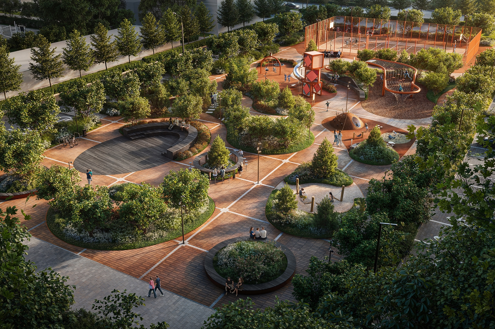 Точкой притяжения станет плаза, на которой разместятся площадка с деревянным амфитеатром, зеленый коворкинг с круглым столом вокруг дерева и гамаки. Там можно будет наблюдать за проходящими мероприятиями или присоединиться к групповым занятиям на свежем воздухе. Зимой на плазе планируется устанавливать новогоднюю елку.
