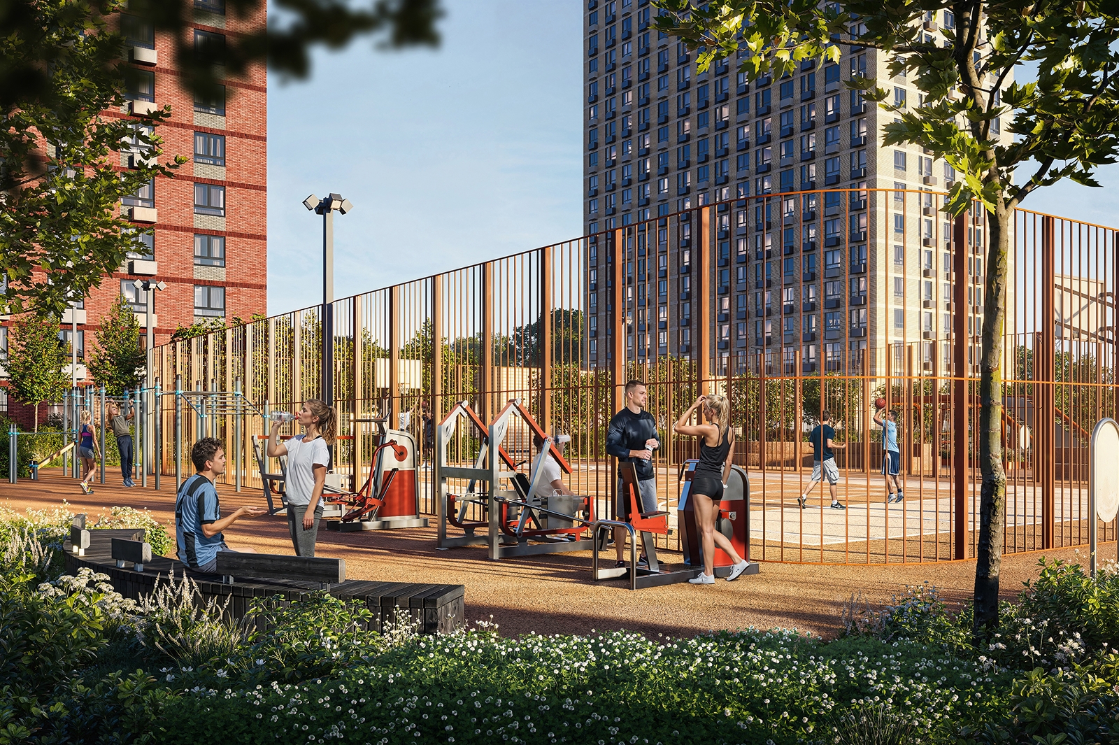 Далее расположится зона спорта, включающая баскетбольную площадку, зону с уличными тренажерами и воркаут-площадку с турниками, брусьями, кольцами и наклонной скамьей.