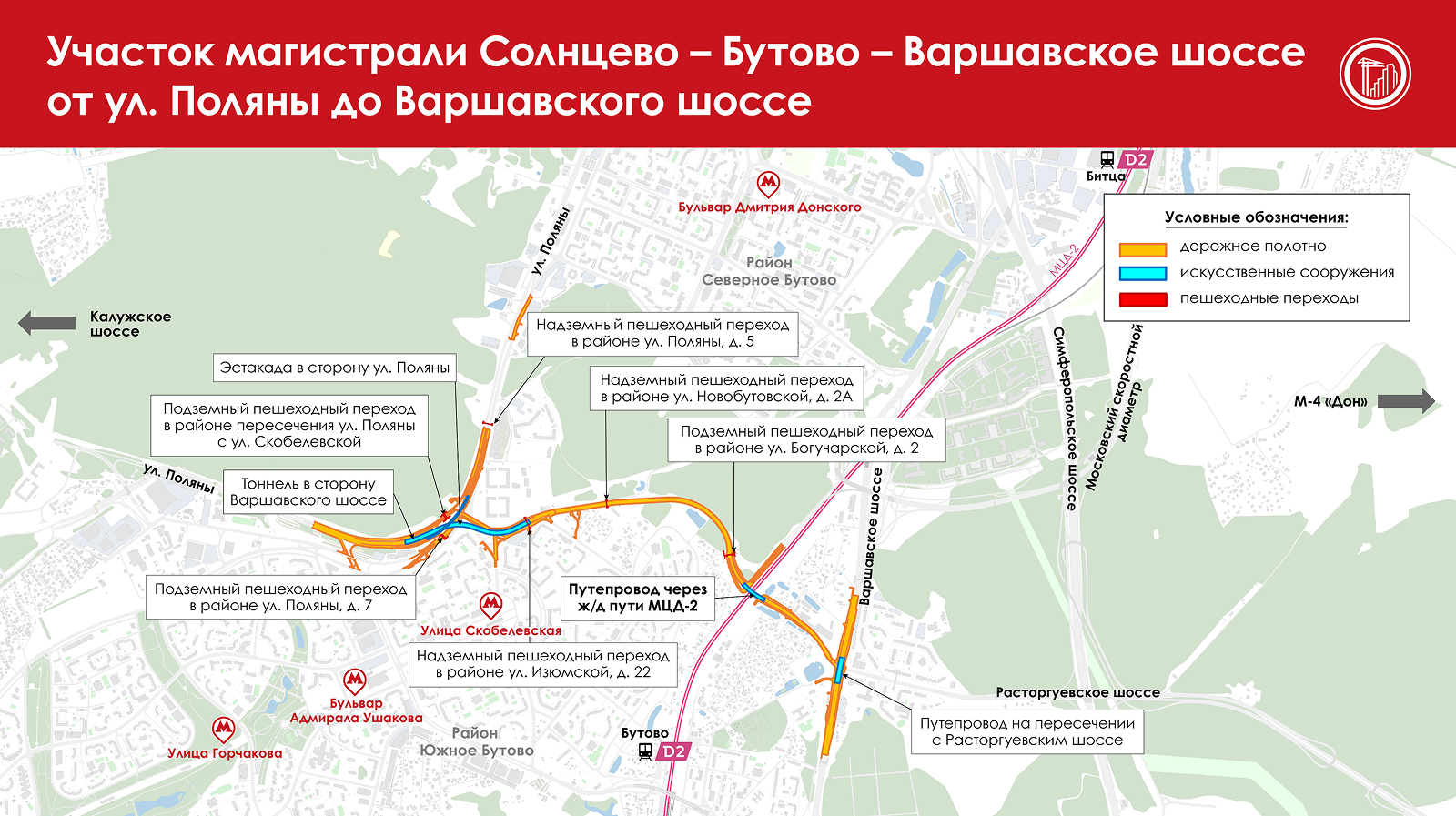 «После ввода участка снизится нагрузка на Варшавское, Симферопольское шоссе и МКАД. Появится комфортная связь Варшавского шоссе с Калужским и Киевским шоссе. Кроме того, улучшится транспортная доступность районов Южное и Северное Бутово, ЮЗАО Москвы и сельского поселения Булатниковского Московской области», – пояснил Сергей Собянин.