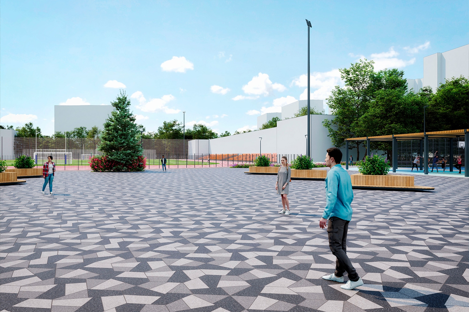 Центральная площадь на территории спортивного комплекса станет местом для прогулок, встреч, проведения праздников и других массовых мероприятий. Раскладка плитки, визуально напоминающая плавающие расколотые «льдинки», станет ее отличительной чертой. В результате стадион будет стилистически связан с новым кампусом Бауманки, один из корпусов которого напоминает ледокол.