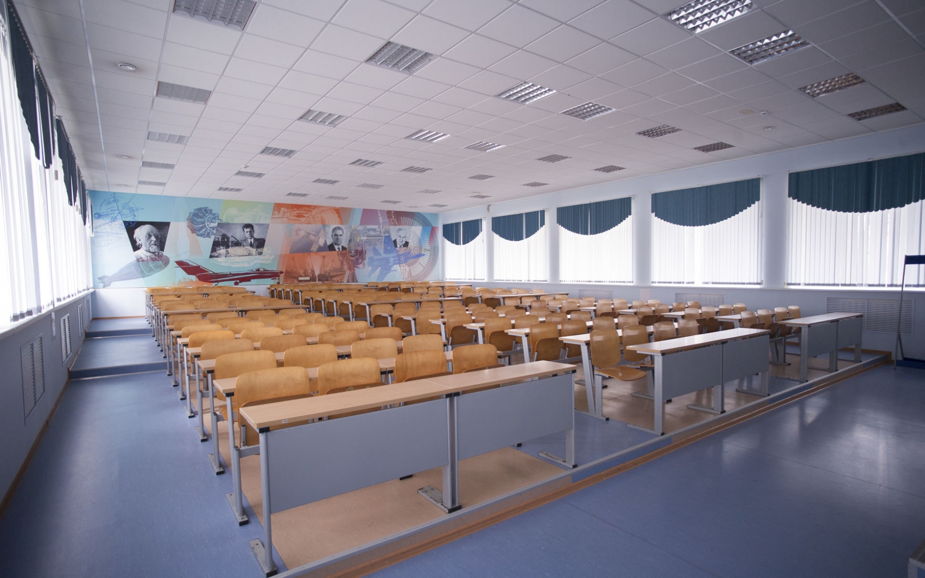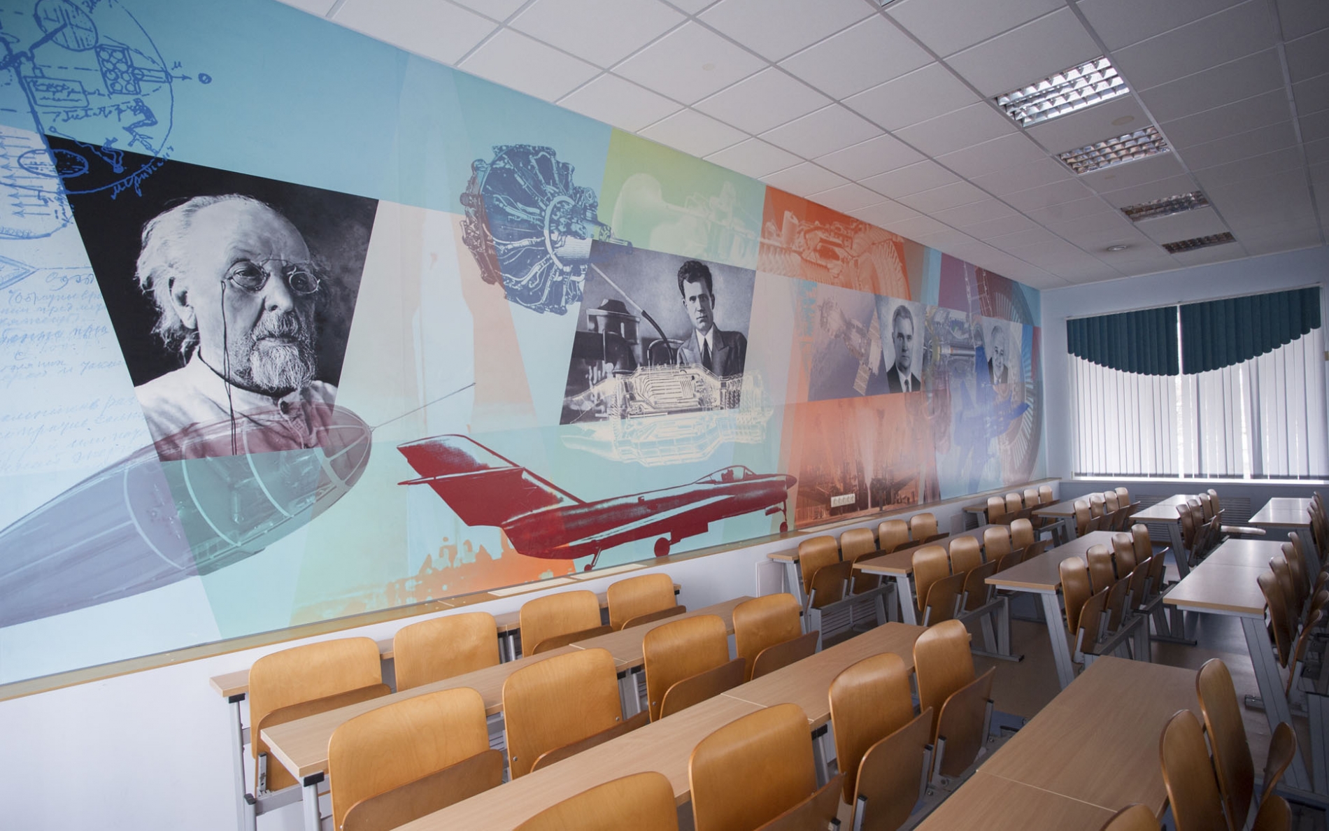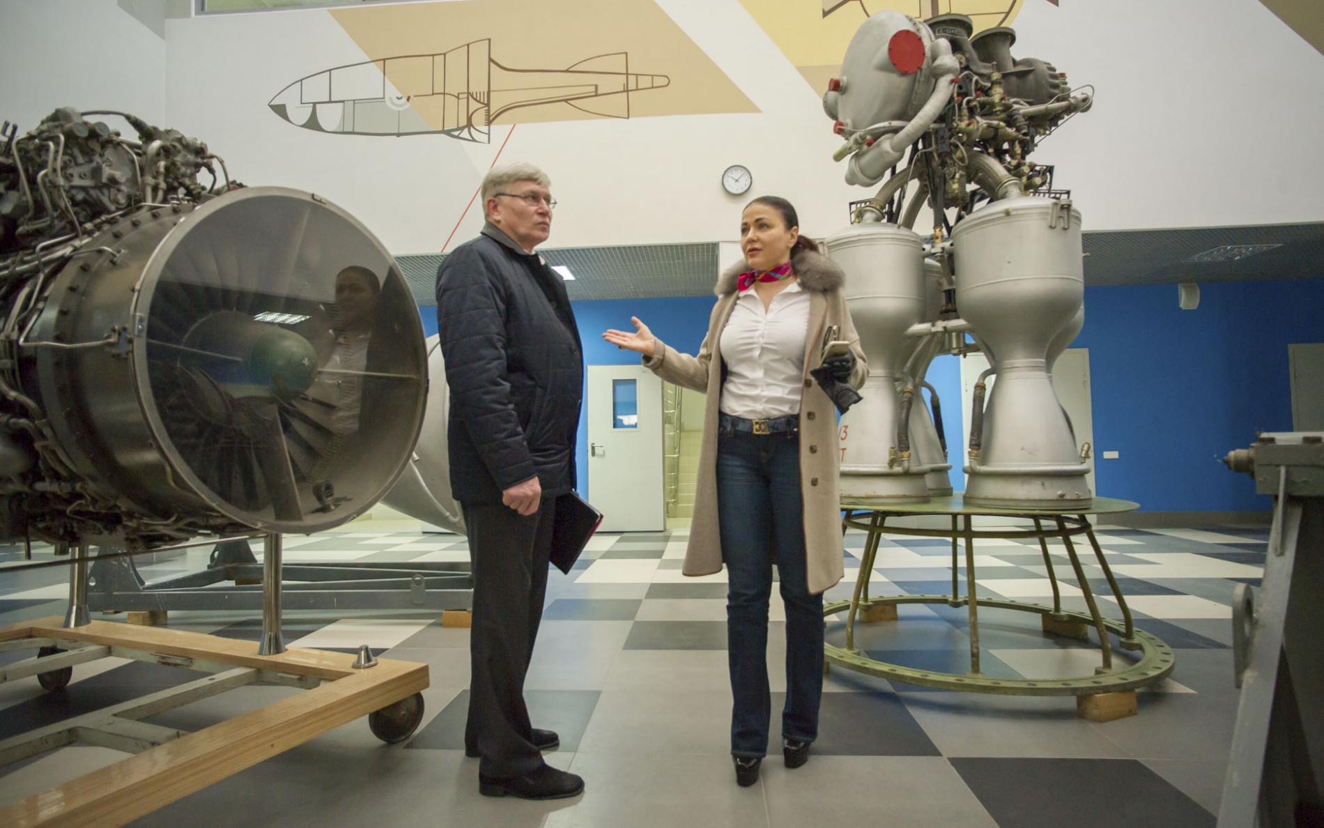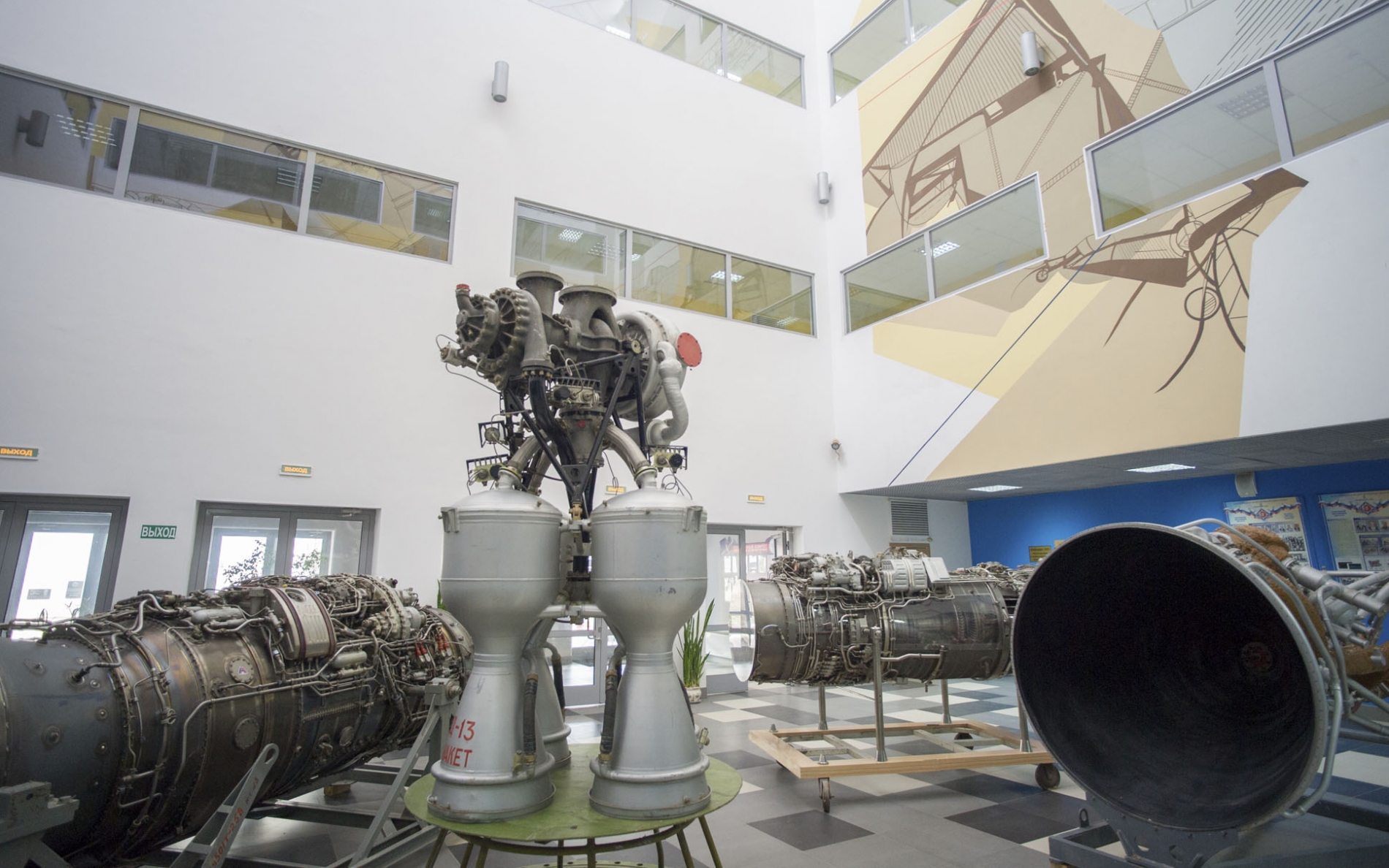 Для наглядности в фойе установлены учебно-выставочные образцы - двигатели знаменитого Ту-144, элементы военных МиГ и Су, маленькая крылатая ракета «земля-воздух». В будущем в цокольном этаже создадут музей двигателей летательных аппаратов, где разместят свыше 100 экспонатов.