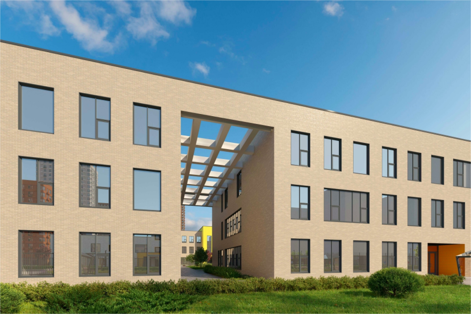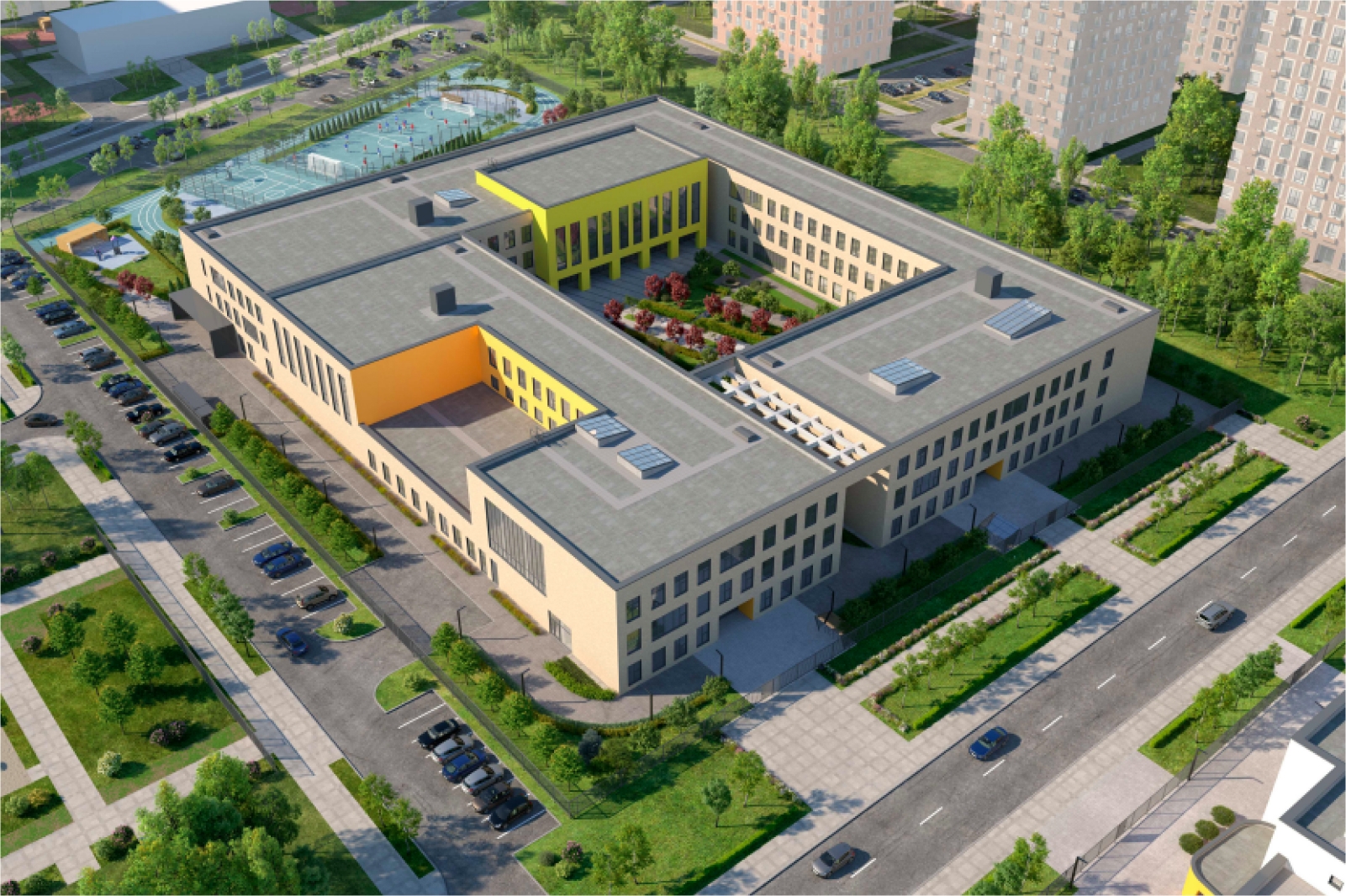 На прилегающей территории установят игровые и спортивные площадки с навесами и безопасным покрытием, выполнят озеленение.