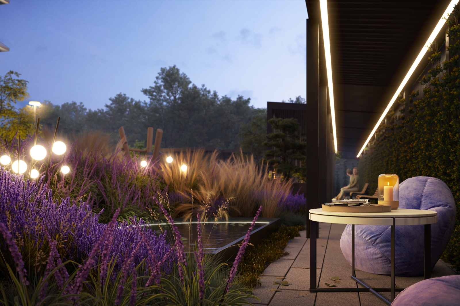 Яркий штрих создадут дизайнерские светильники в виде тонкого корпуса, имитирующего ветки деревьев. Уникальность осветительных приборов состоит в том, что их можно запрограммировать на разные световые сценарии, за счет чего сенсорный сад будет регулярно менять световую окраску. Светильники, расположенные между невысокими густыми кустарниками лиловых оттенков, образуют единую линию ландшафта. Так будет создан образ бесконечного сказочного пути, направляющего посетителей сада из одной зоны в другую.