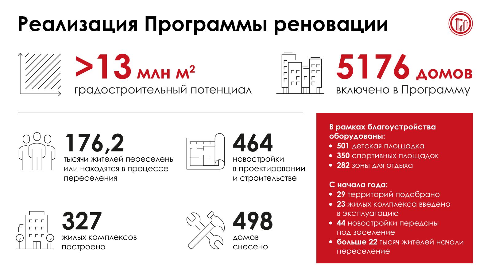 Напомним, программа реновации жилищного фонда была утверждена Сергеем Собяниным в августе 2017 года. В нее включено 5176 домов – это более 350 тыс. квартир общей площадью 16,4 млн кв. метров, в которых проживает почти 1 млн москвичей. Первые новоселы переехали по реновации в феврале 2018 года.