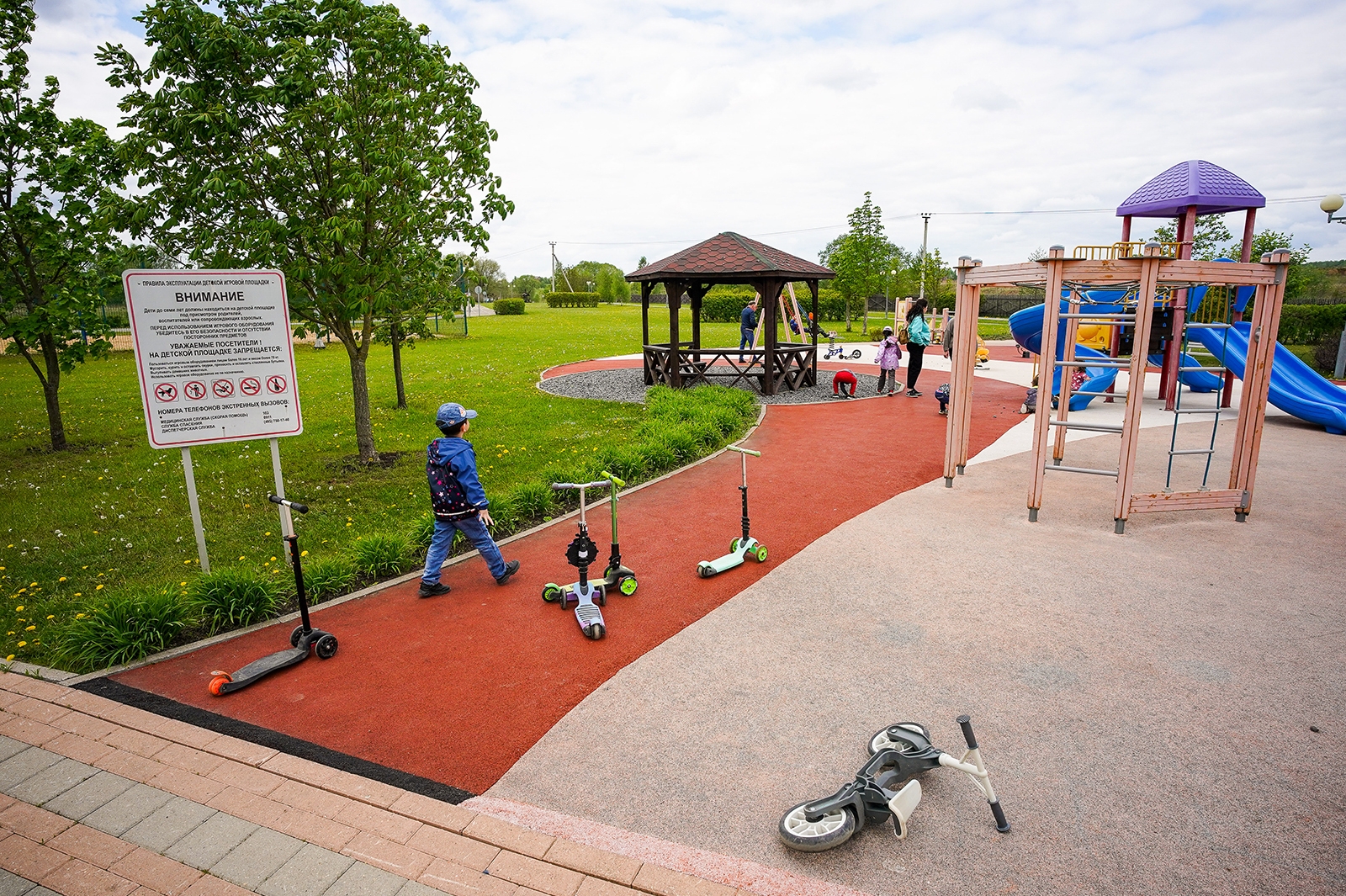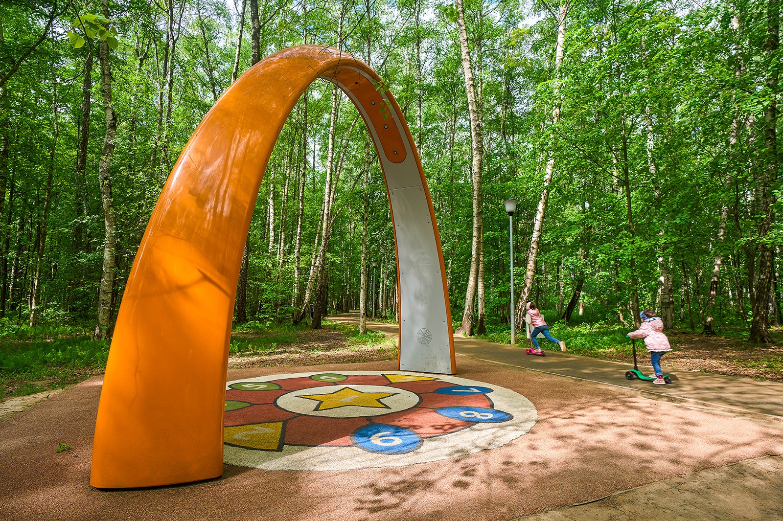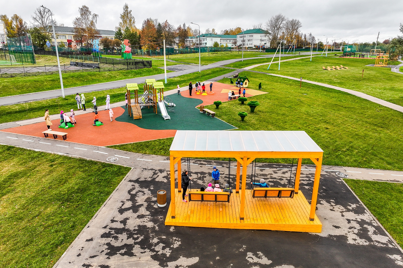 Здесь проложены дорожки-тропинки из разных видов покрытия, в том числе из экоматериалов – гранитного отсева и натурального камня. В большом игровом комплексе для детей оборудованы горки и лесенки. Все желающие могут покачаться на качелях высотой пять метров.