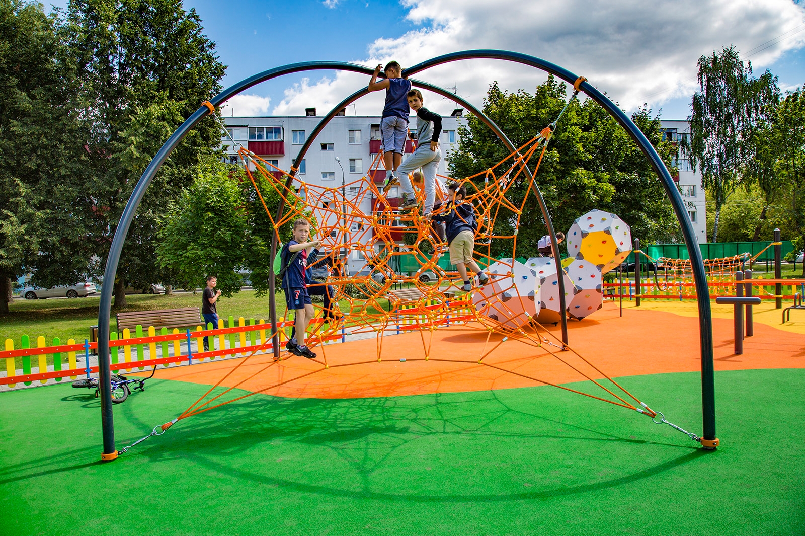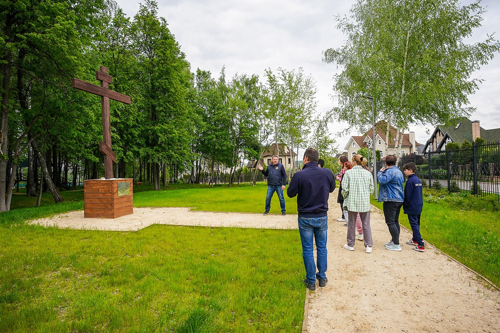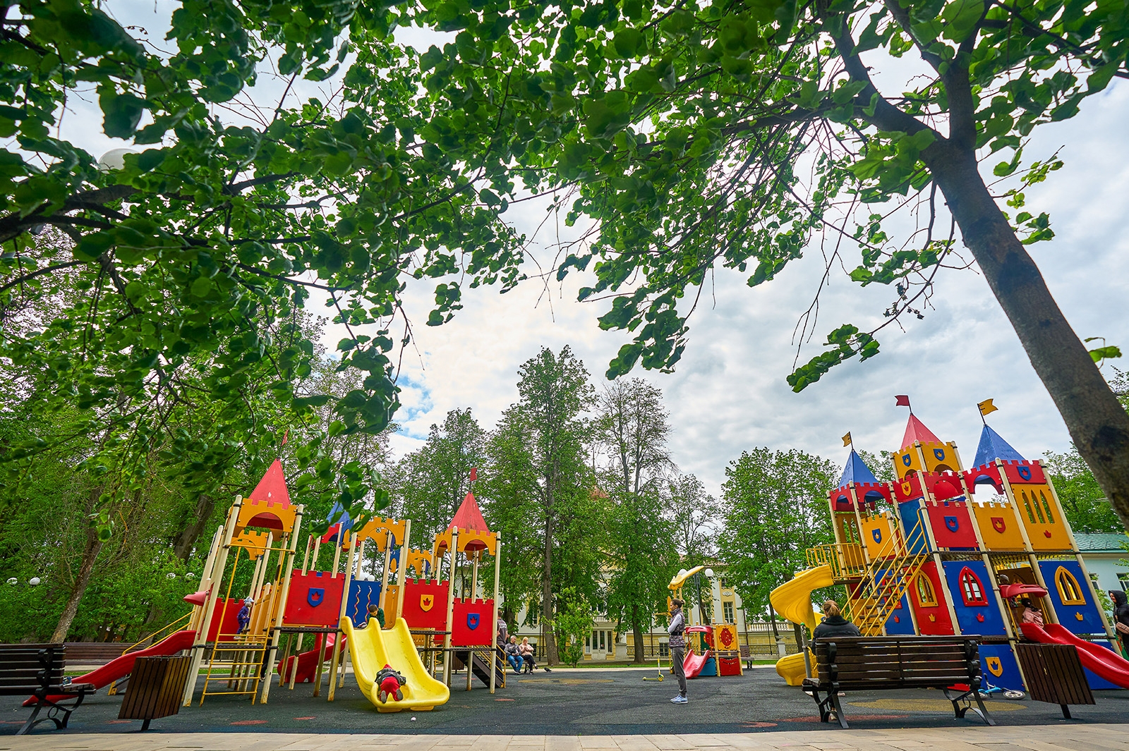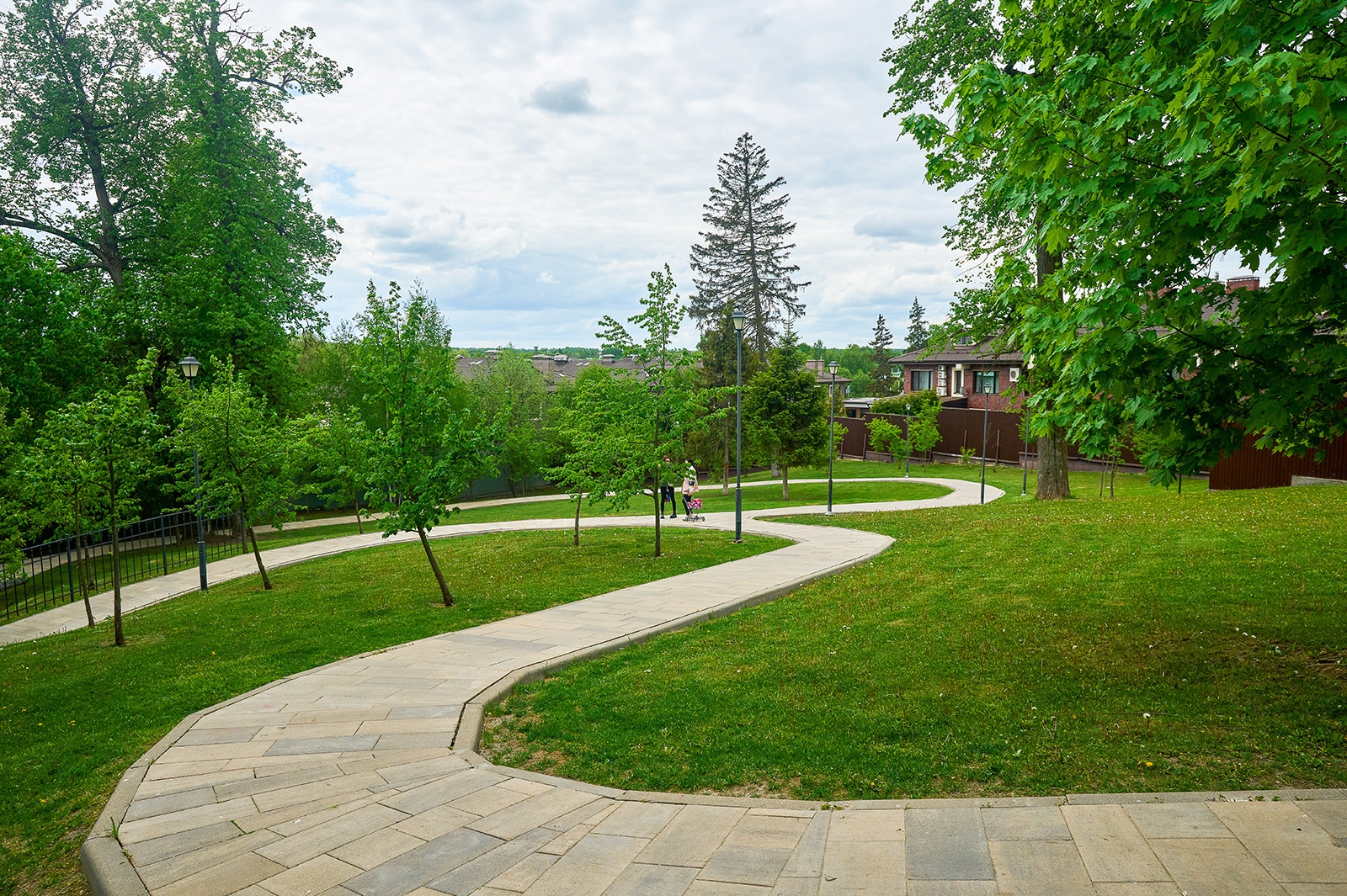 Здесь проложены дорожки-тропинки из разных видов покрытия, в том числе из экоматериалов – гранитного отсева и натурального камня. В большом игровом комплексе для детей оборудованы горки и лесенки. Все желающие могут покачаться на качелях высотой пять метров.