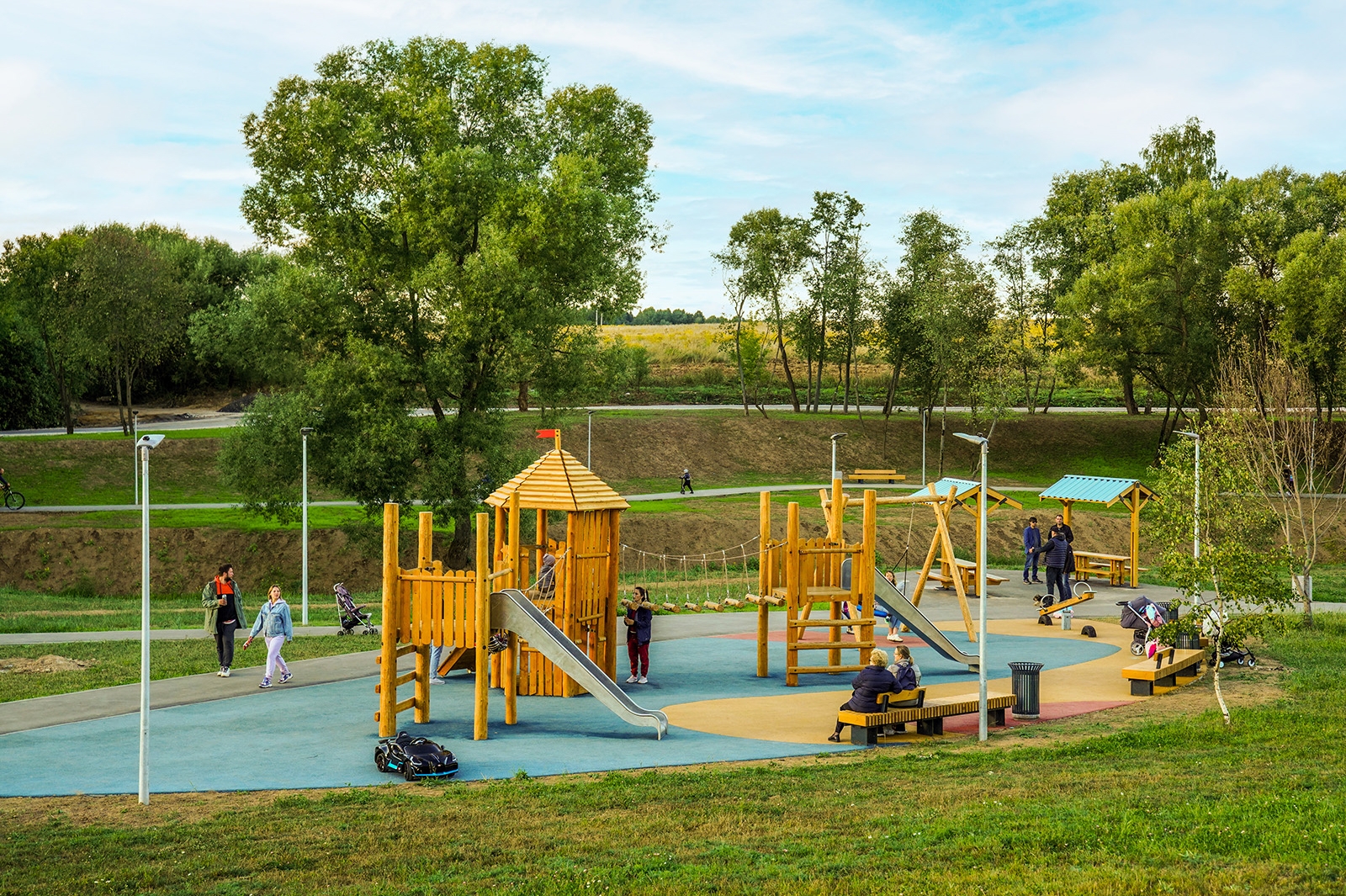 В парке проложили максимально удобную сеть прогулочных тропинок из деревянного настила и бетонной плитки. На беговой дорожке использовали терравей – прочное пористое покрытие, пропускающее воду. На детских площадках есть качели, карусели, канатные комплексы и развивающее оборудование. Некоторые их элементы выполнены в экостиле – из дерева. Другие площадки сделаны в виде футуристических комплексов с металлическими горками-трубами.