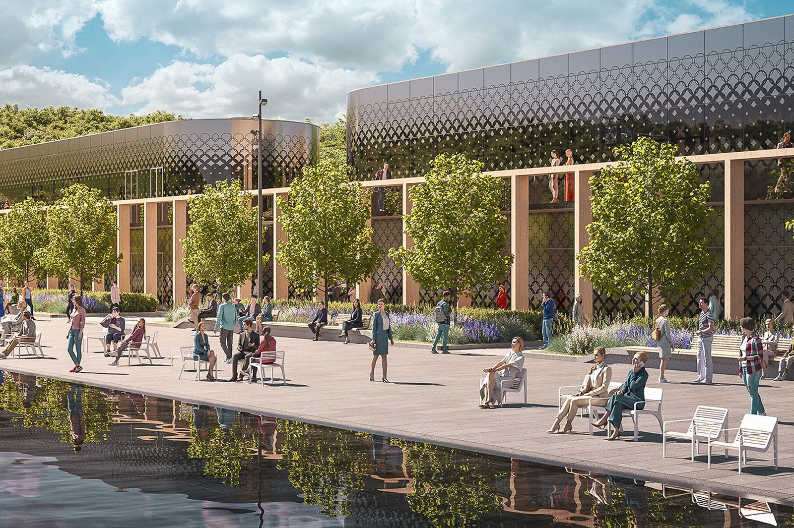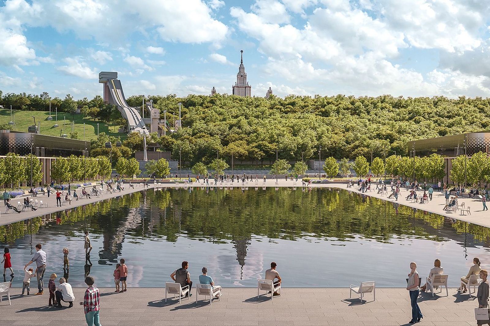 По его словам, летом вокруг водной глади расположатся места отдыха со столиками и шезлонгами, по вечерам здесь можно будет проводить водные шоу. Зимой на центральной площади и боковых аллеях планируется заливать каток.