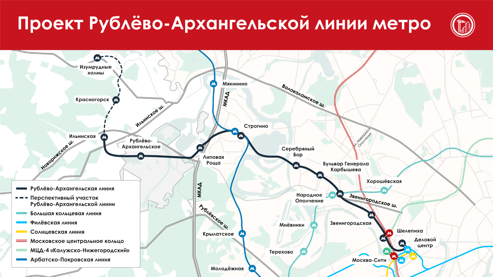 «Рублёво-Архангельская ветка пройдет от «Москвы-Сити» до Рублёво-Архангельского за МКАД. Она строится в несколько этапов», – пояснил Сергей Собянин.