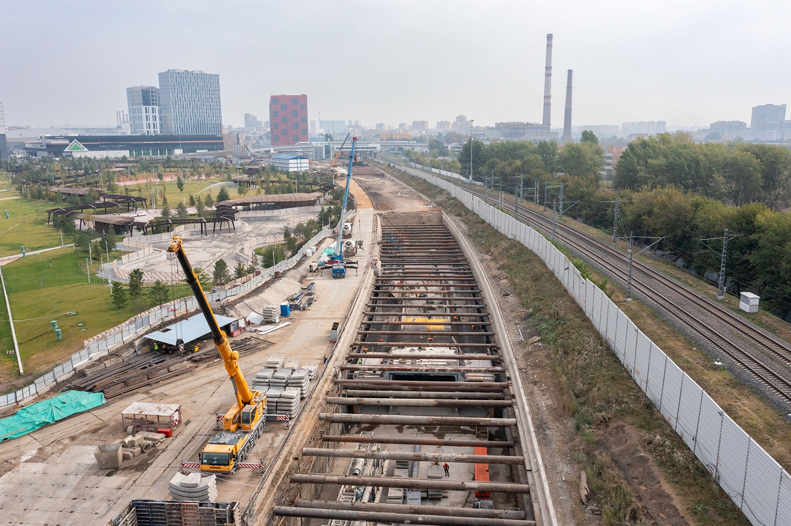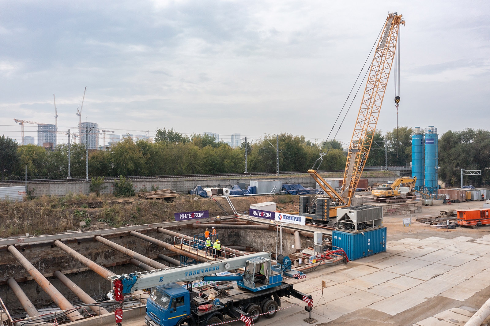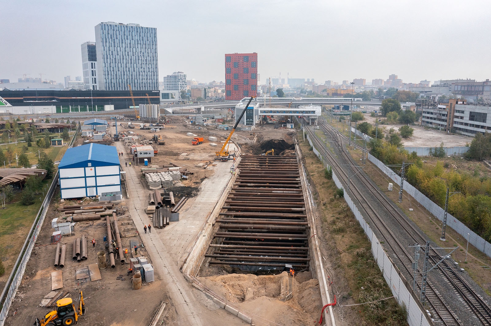 Сейчас завершается устройство ограждающих конструкций, ведется выемка грунта и крепление котлована, устройство основных конструкций будущей станции и обратная засыпка. Строительная готовность станции составляет 50%.