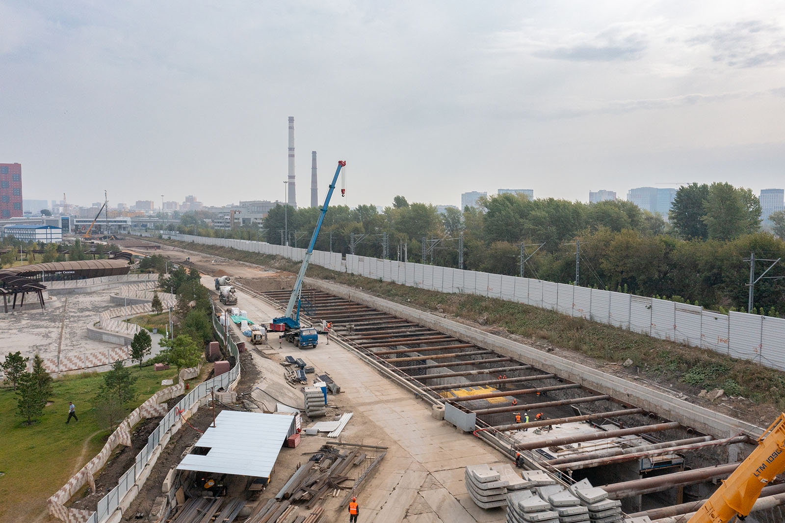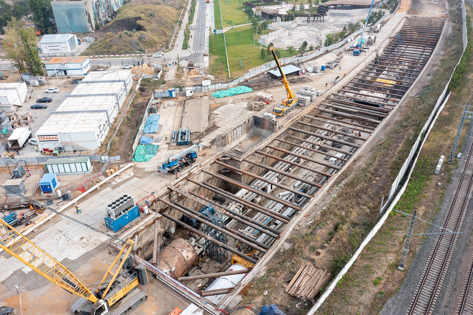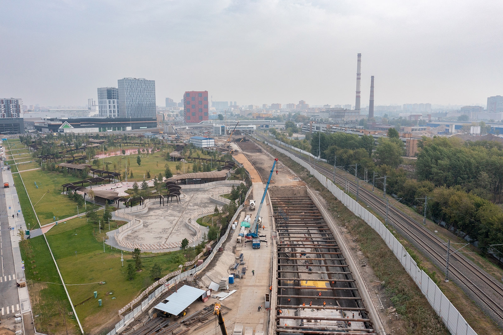 Сейчас завершается устройство ограждающих конструкций, ведется выемка грунта и крепление котлована, устройство основных конструкций будущей станции и обратная засыпка. Строительная готовность станции составляет 50%.