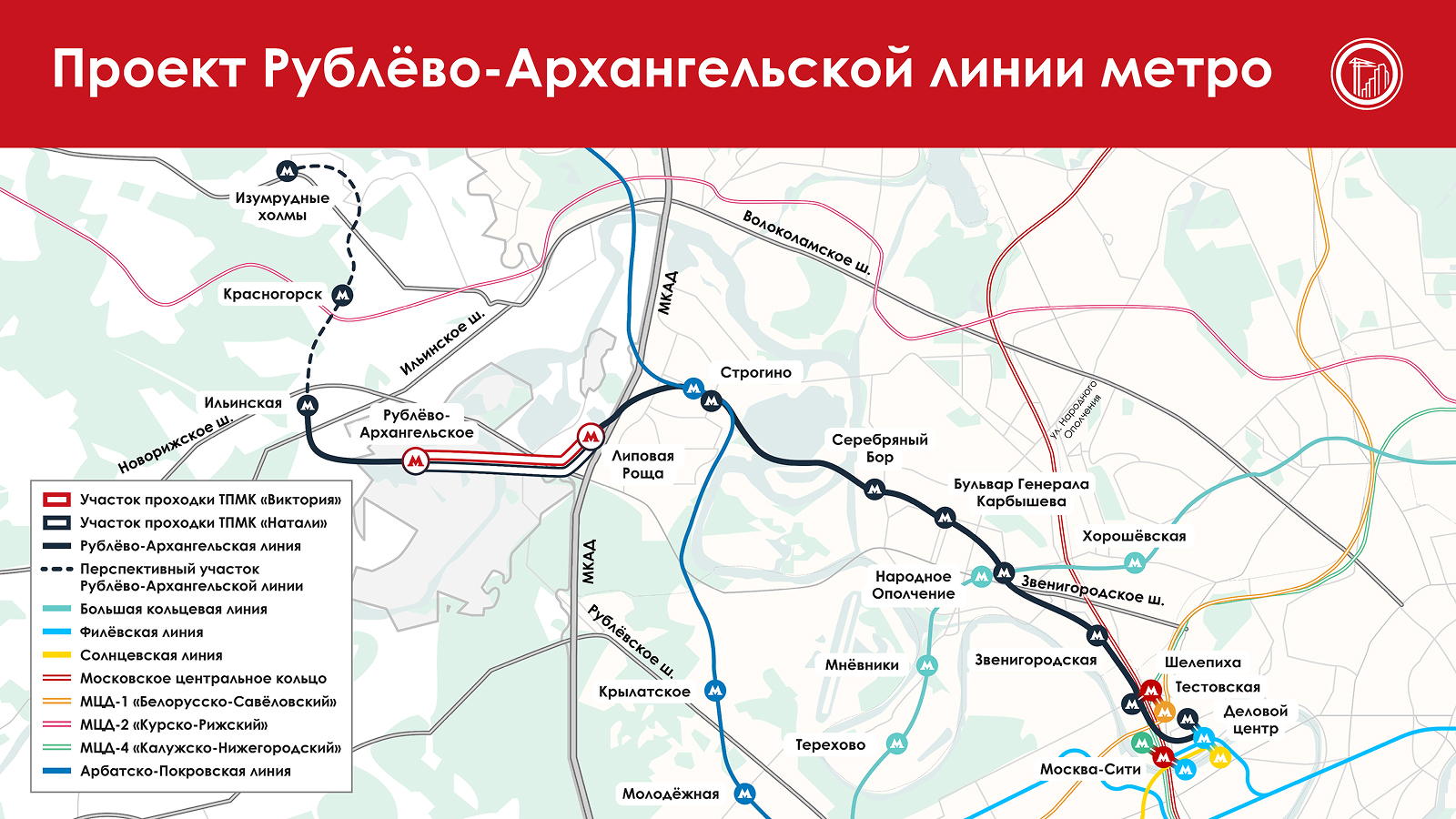Он отметил, что новая ветка свяжет «Москву-Сити» и «СберСити» в Рублёво-Архангельском. На ней появятся пересадки на Московское центральное кольцо, Солнцевскую, Филёвскую, Арбатско-Покровскую и Большую кольцевую линии (БКЛ).