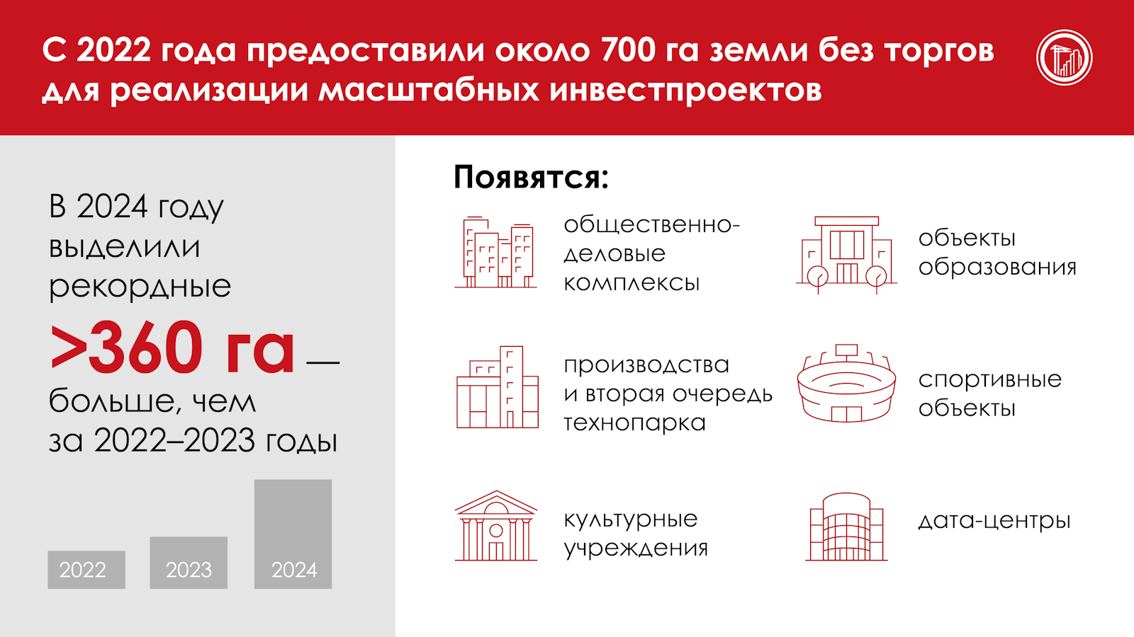 По его словам, больше половины – свыше 360 га – было выделено в прошлом году. На участках инвесторы построят, в том числе: