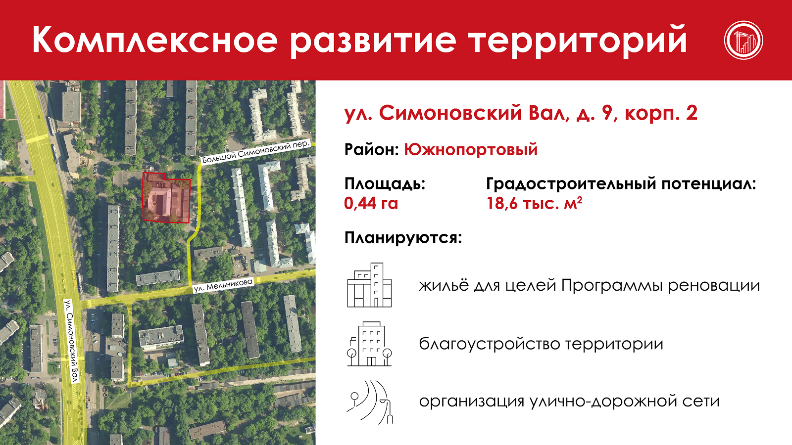 Как уточняется на портале mos.ru, участок между Большим Симоновским пер. и ул. Мельникова находится по адресу: ул. Симоновский Вал, д. 9, корп. 2, недалеко от станции метро «Пролетарская».
