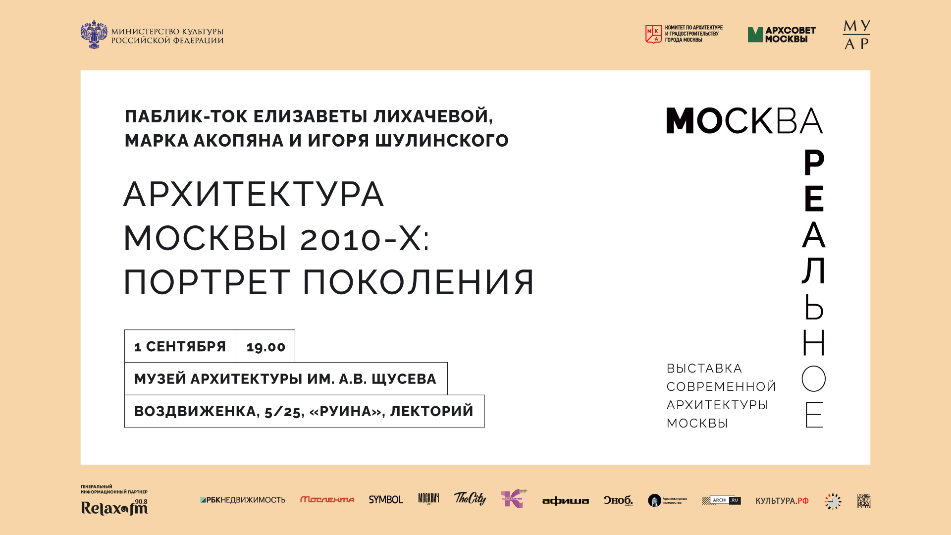 Тема встречи: итоги десятилетия новой архитектурной политики и современный облик Москвы. Участниками мероприятия станут директор Музея архитектуры им. А.В. Щусева, куратор выставки «Москва. Реальное» Елизавета Лихачёва и старший научный сотрудник Музея, сокуратор экспозиции Марк Акопян.