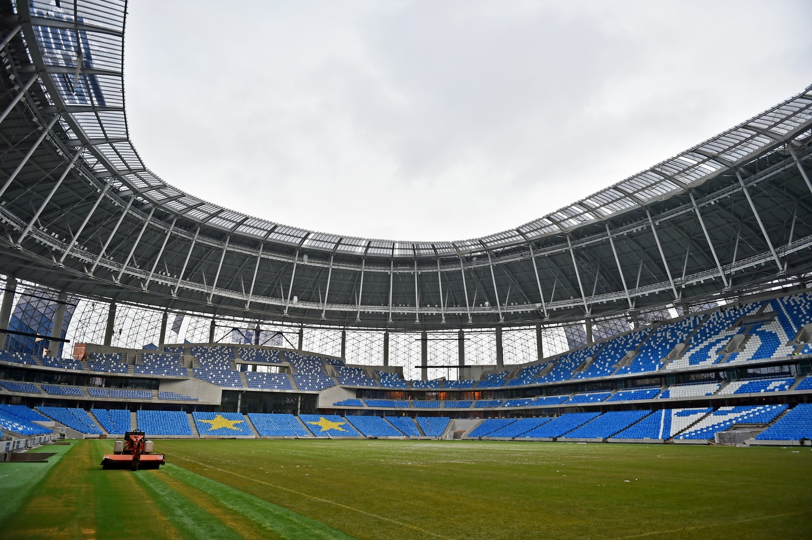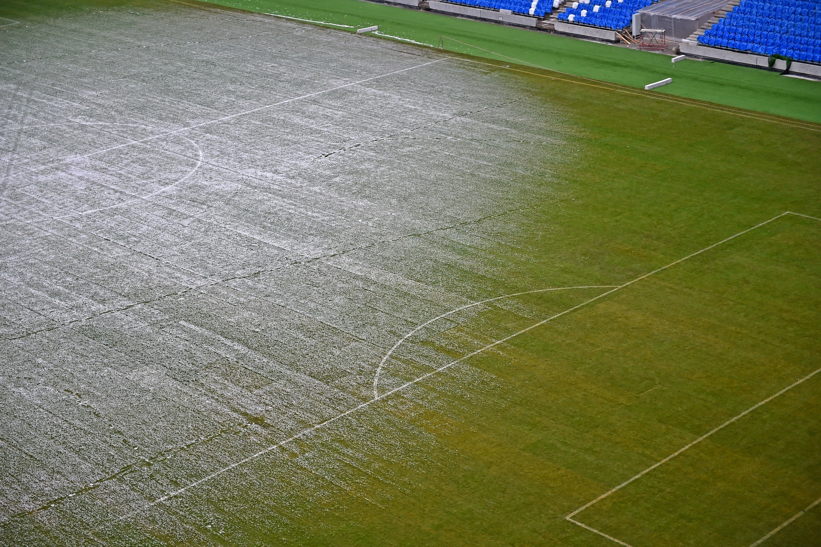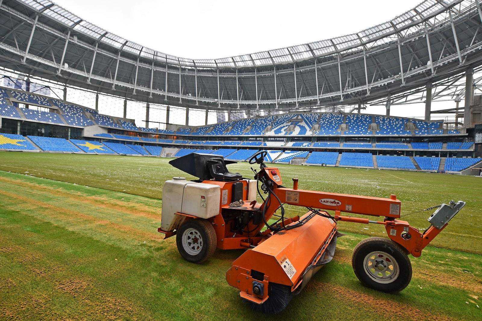 На футбольном поле уложен натуральный газон. Поле оборудовано системами дренажа, полива, подогрева.