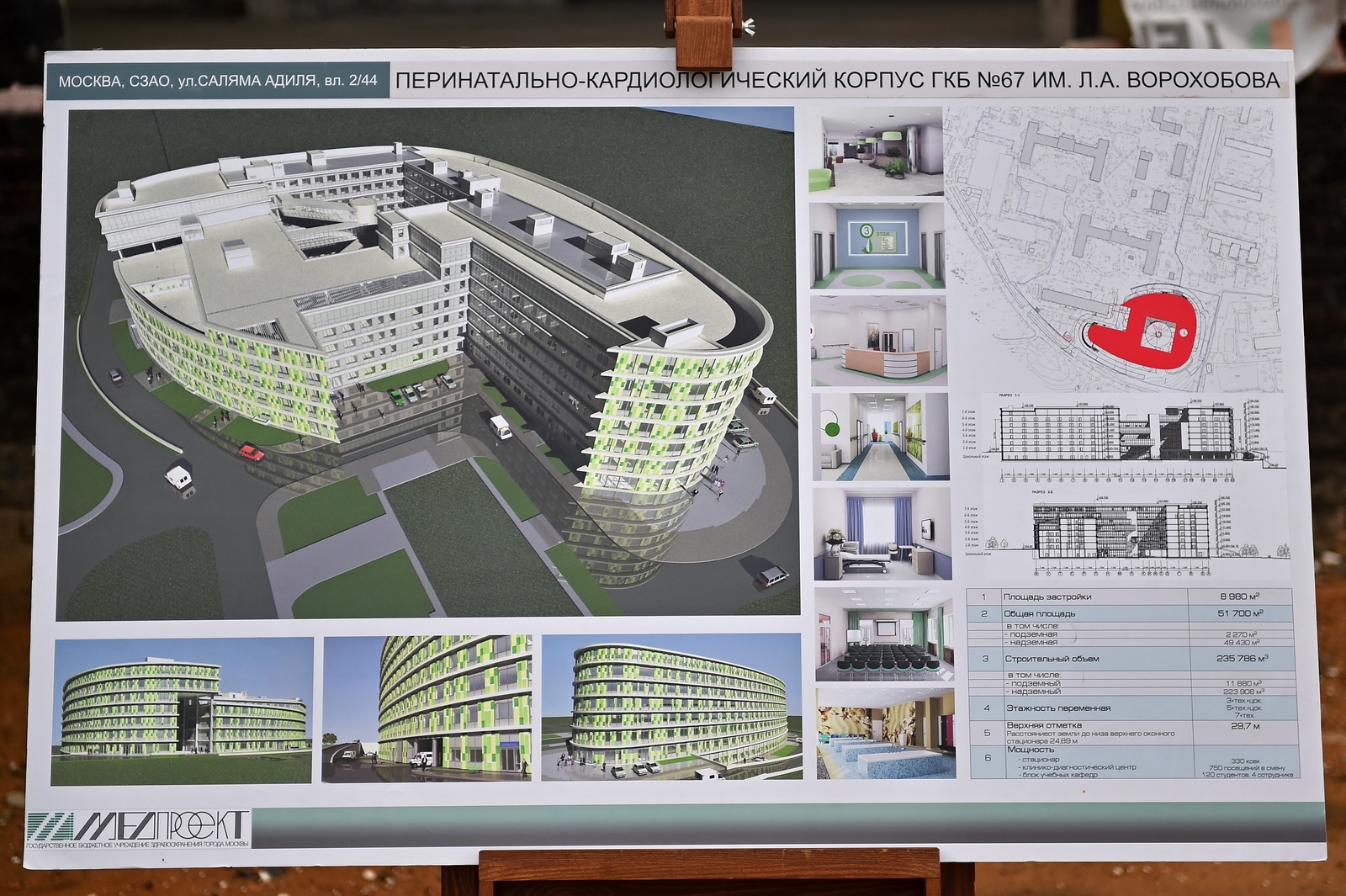 «Здесь строится новый корпус уникального в России перинатально-кардиологического центра. Площадь здания составит 50 тысяч квадратных метров, вся больница занимает 70 тысяч квадратных метров. Это крупная современная клиника, которая сможет принимать около 20 тысяч родов в год, это одна пятая часть всех родов в Москве. При этом будут принимать уникальные роды с сердечно-сосудистой патологией матерей и новорожденных. Москва после открытия этой клиники выйдет на первое место по качеству оказания перинатальной медицинской помощи», - сказал Сергей Собянин.