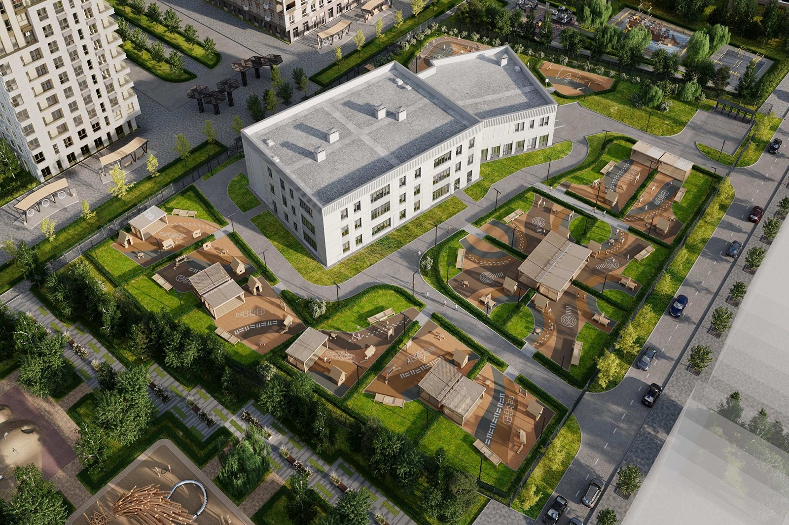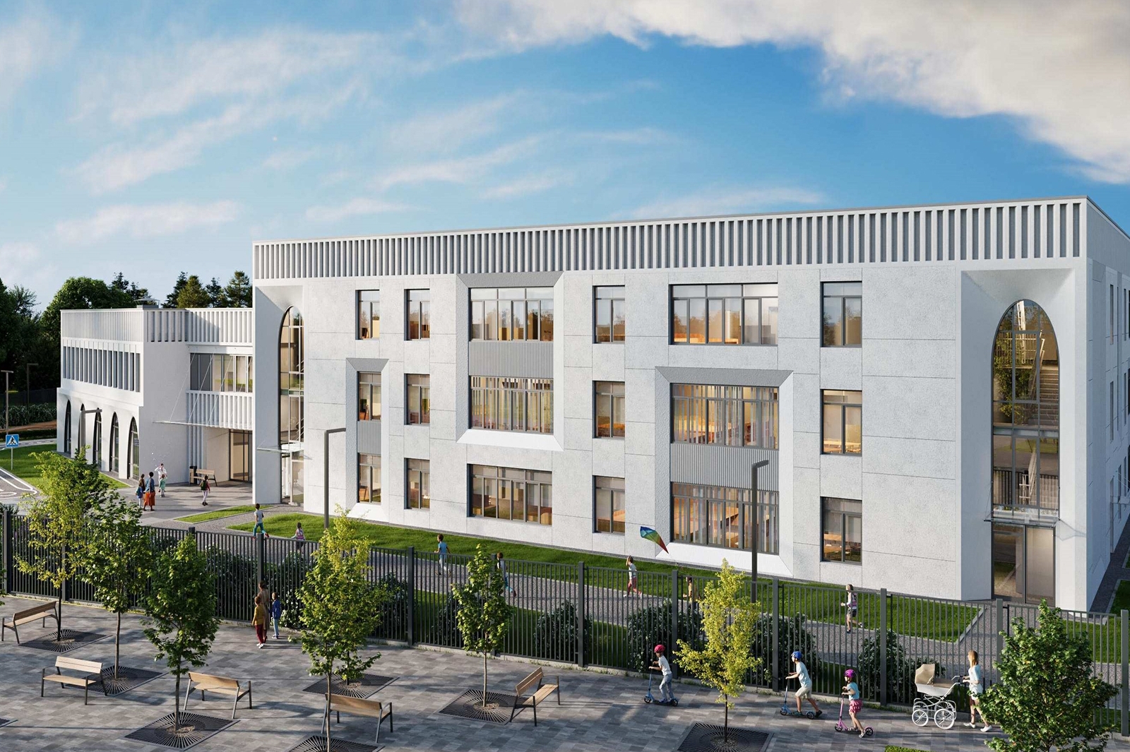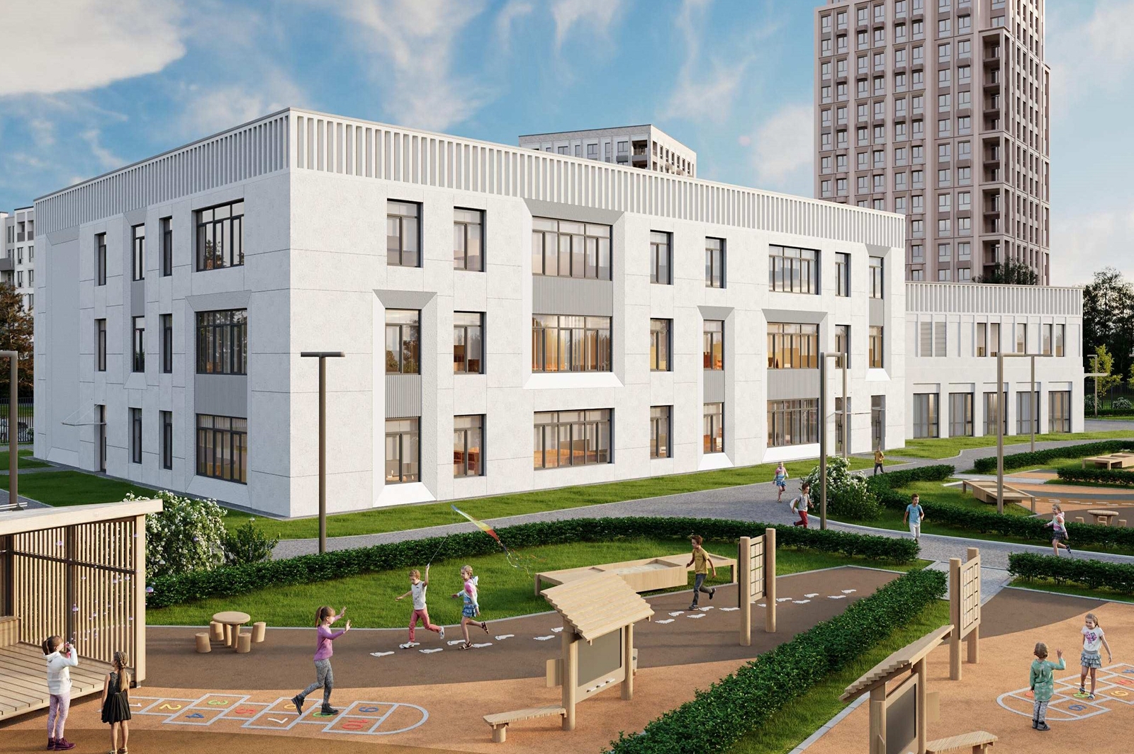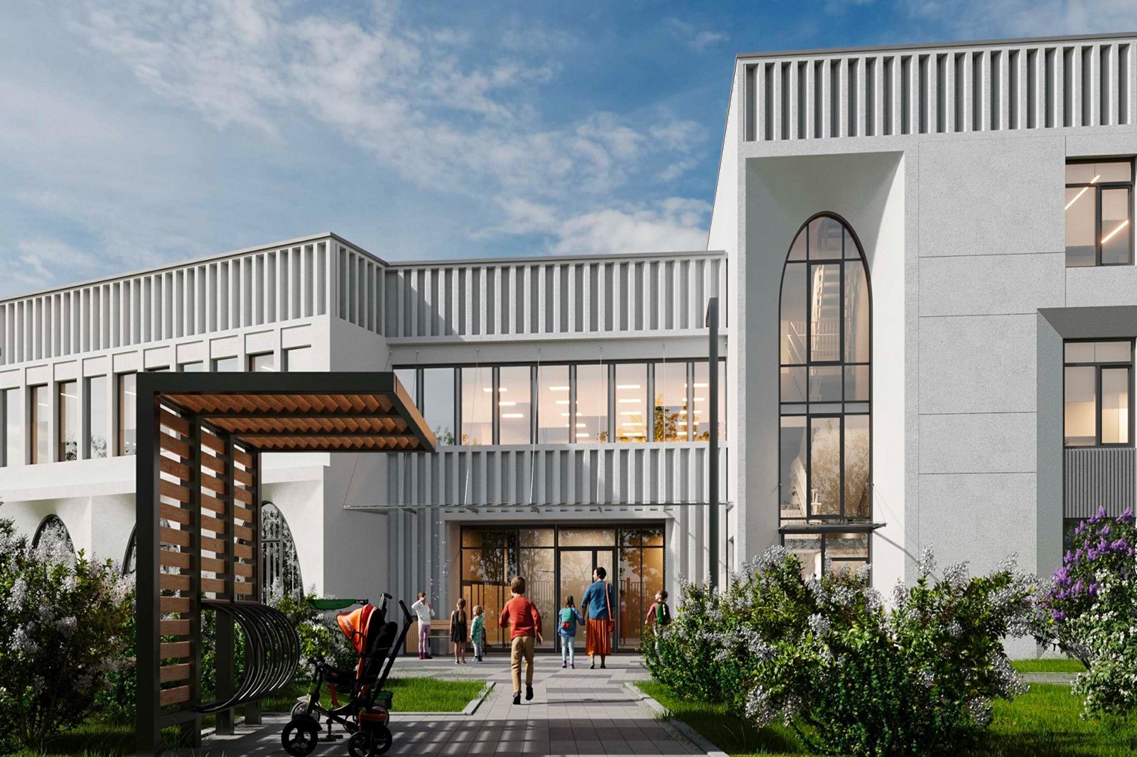 На востоке столицы также появится двухэтажный детский сад, где фасады украшены чередующимися золотистыми и бежевыми панелями и модульными витражами, задающими ритм всему зданию.