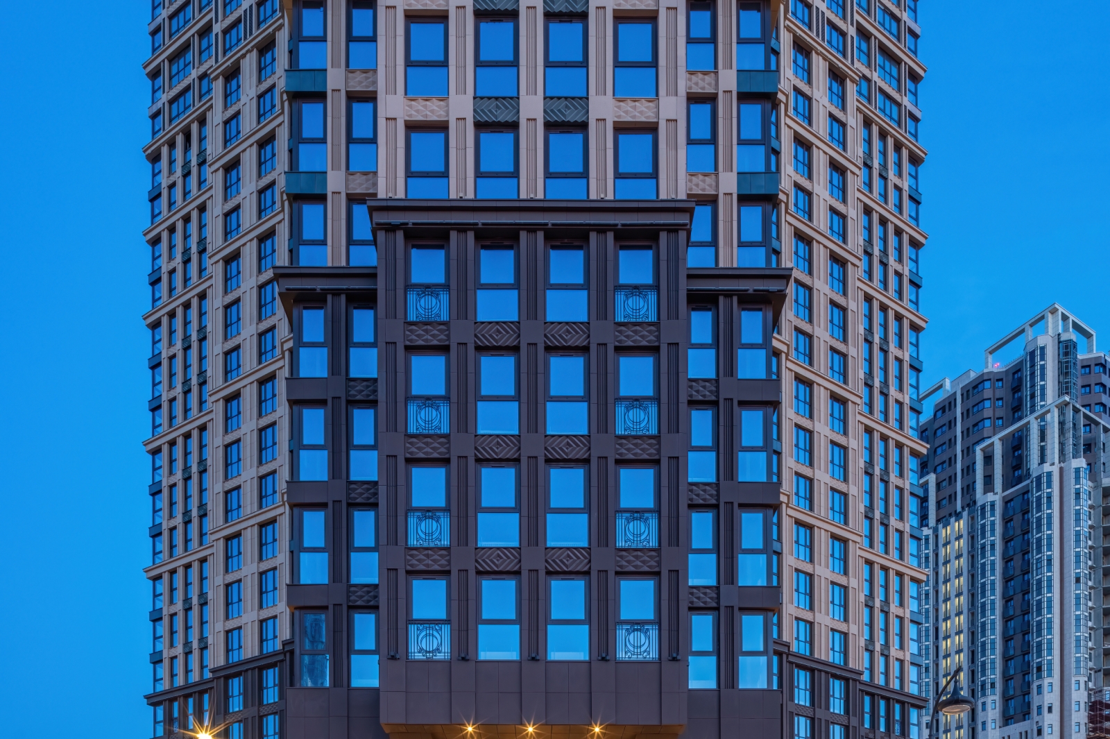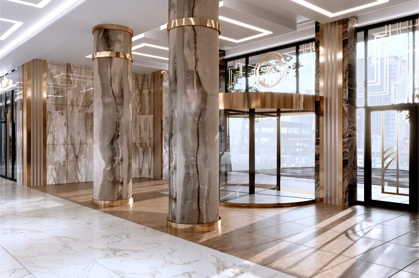 Девелопер жилого дома – SEZAR GROUP. Дизайн-концепция интерьеров галереи разработана студией дизайна и архитектуры Nоbbey. Вестибюли украшены колоннами с ручной росписью, геометричными панно, декоративными рельефными аксессуарами.