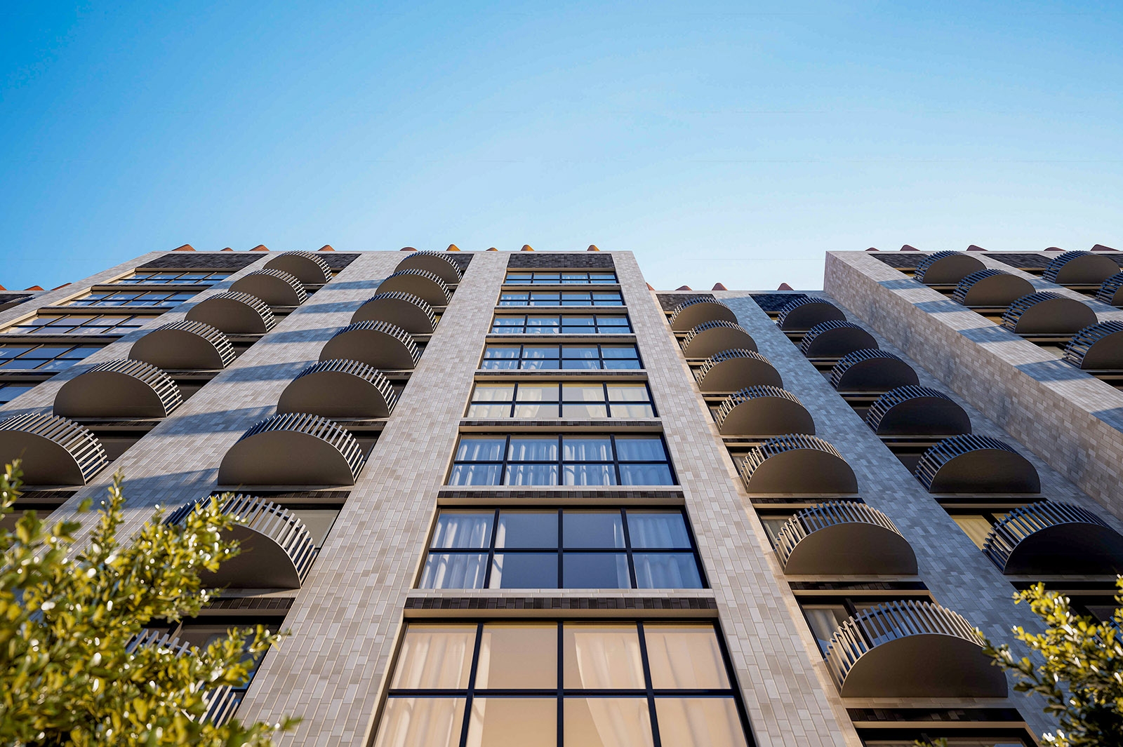 Фасады выполнят из навесных трехслойных стеновых панелей, облицованных кирпичом. На них установят металлические корзины для кондиционеров. Входные группы оформят витражным остеклением.