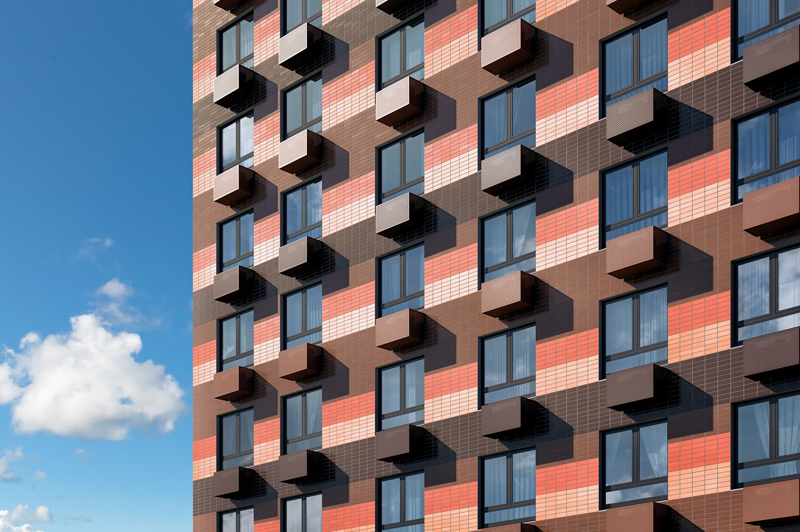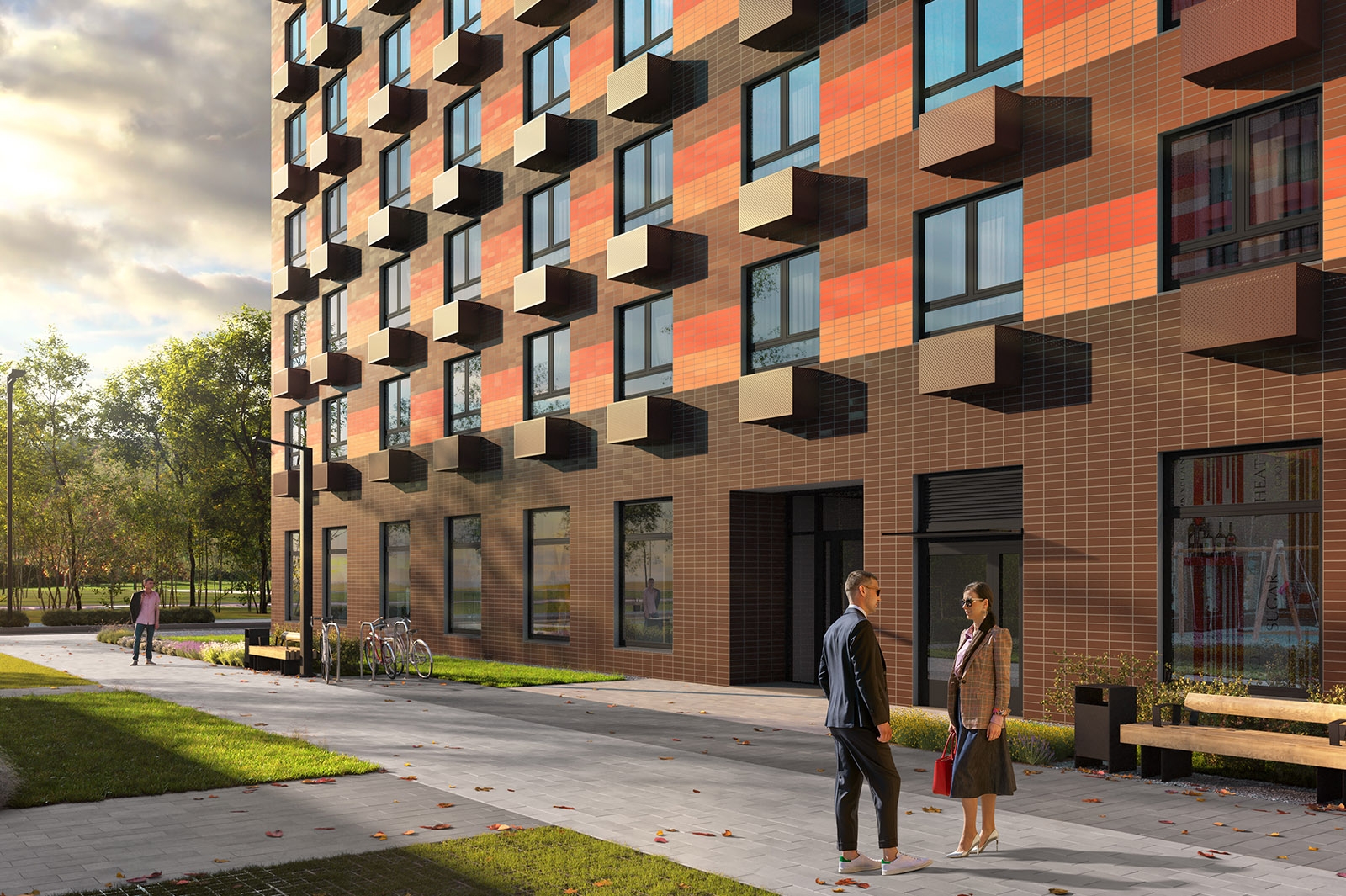 Он отметил, что навесные трехслойные железобетонные панели, из которых выполнен фасад зданий, облицованы керамической плиткой теплых оттенков.