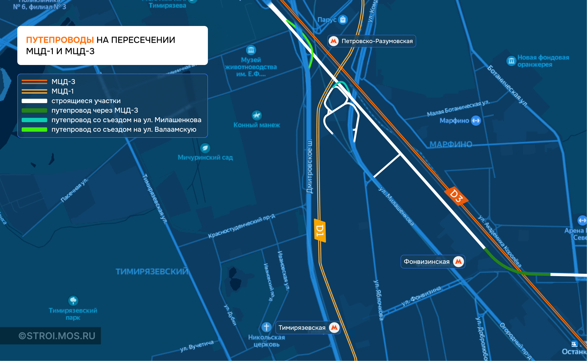 Сейчас продолжается сооружение опор путепровода через пути. Запроектировано строительство и реконструкция 5,1 км дорог. Это путепроводы со съездами с магистрали на улицу Милашенкова и с Дмитровского шоссе на улицу Валаамскую и два надземных пешеходных перехода на проектируемой автомагистрали, которая расположится вдоль МЦД-3.