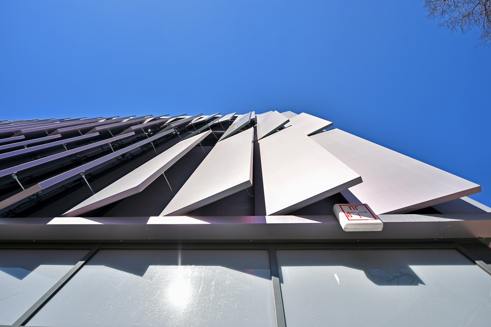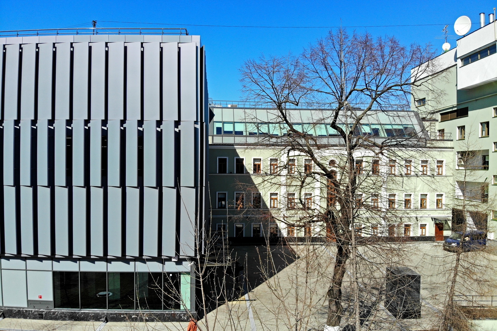 Фасад четырехэтажного здания покрыли навесными панелями – «хамелеонами»: они переливаются разными цветами. Такое оформление позволило зрительно отделить новое здание от старого.