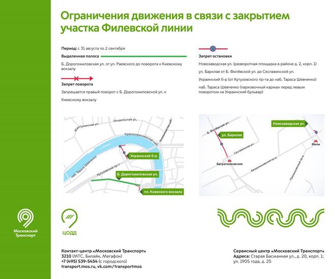 В период закрытия наземного участка Филевской линии станции «Киевская» и «Кунцевская» свяжут компенсационные автобусы КМ1 – они будут следовать с остановками у метро «Кутузовская», «Багратионовская», «Филёвский парк» и «Пионерская».