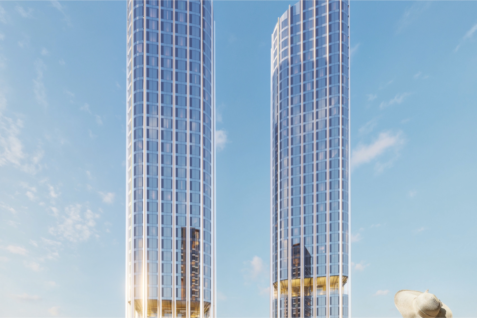 Акцентом всего ансамбля станут серебряные башни. Это два высотных корпуса в 42 и 38 этажей урбан-блока River 1. Они расположатся в 500 метрах от реки, от воды их будет отделять только природный парк. Благодаря тому, что корпуса тремя плоскостями обращены к реке, в них обеспечат максимальное количество видовых квартир. Над созданием концепции работало архитектурное бюро АПЕКС.