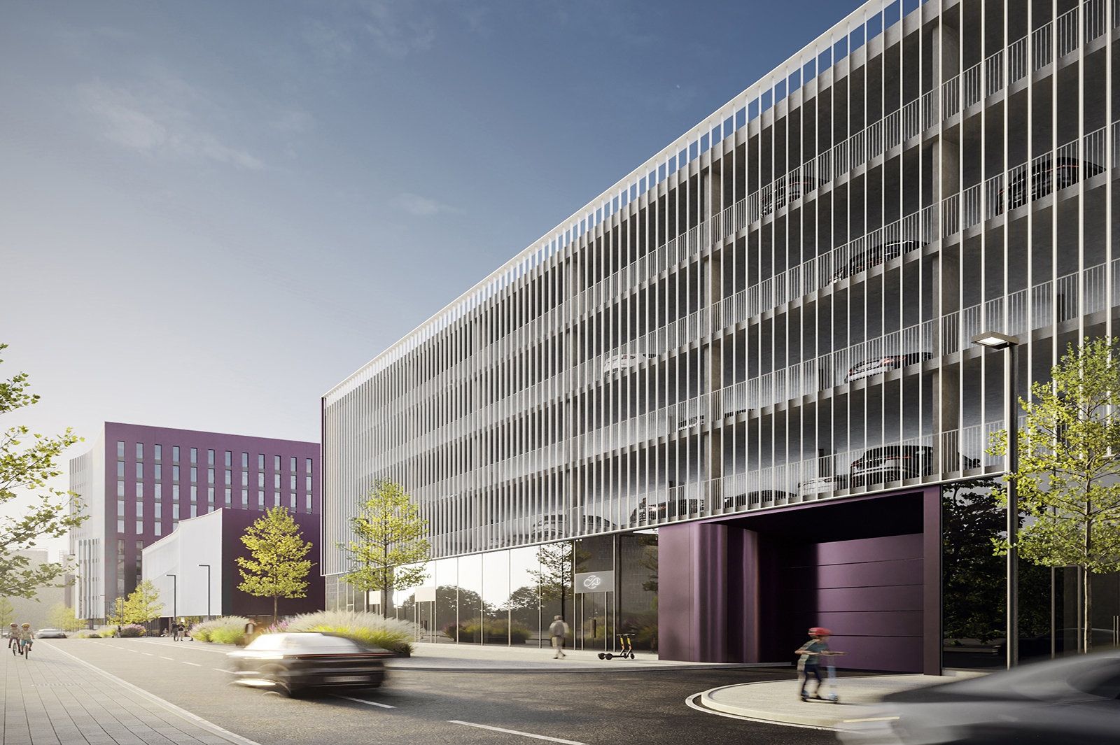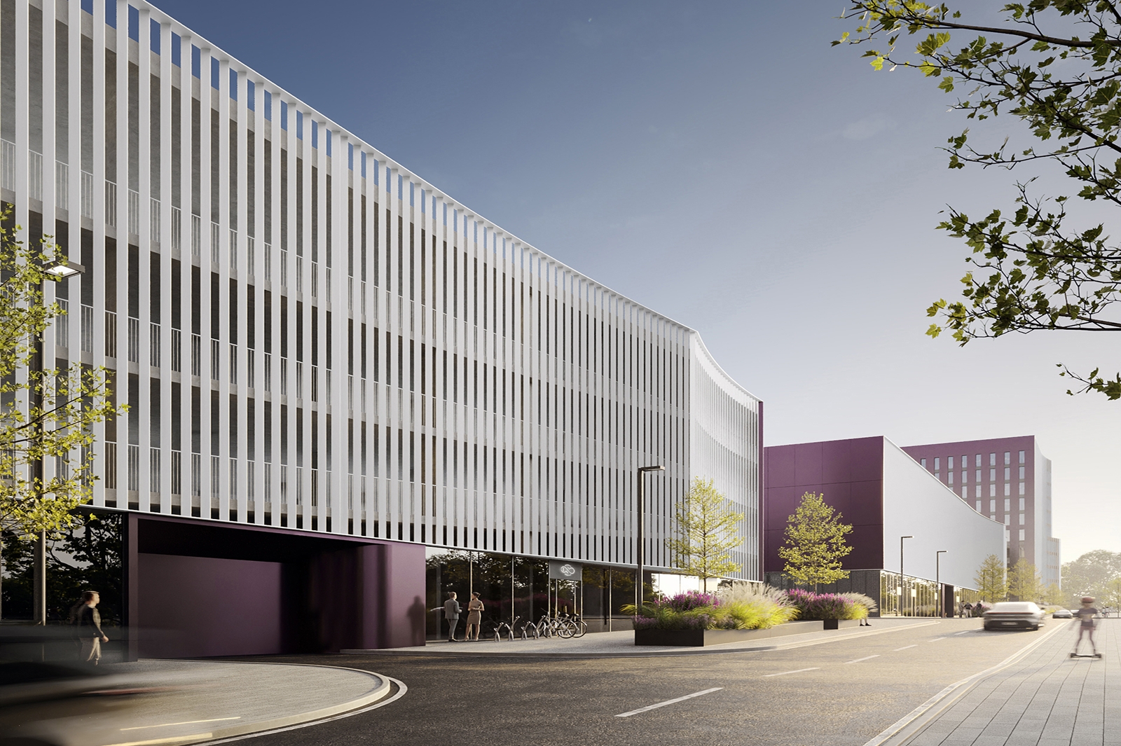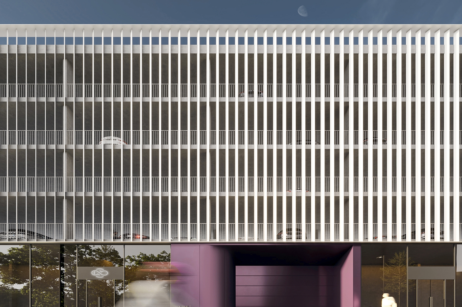Фасады паркинга повторят архитектурные приемы основного здания, в отделке используют белые ламели с частым шагом.