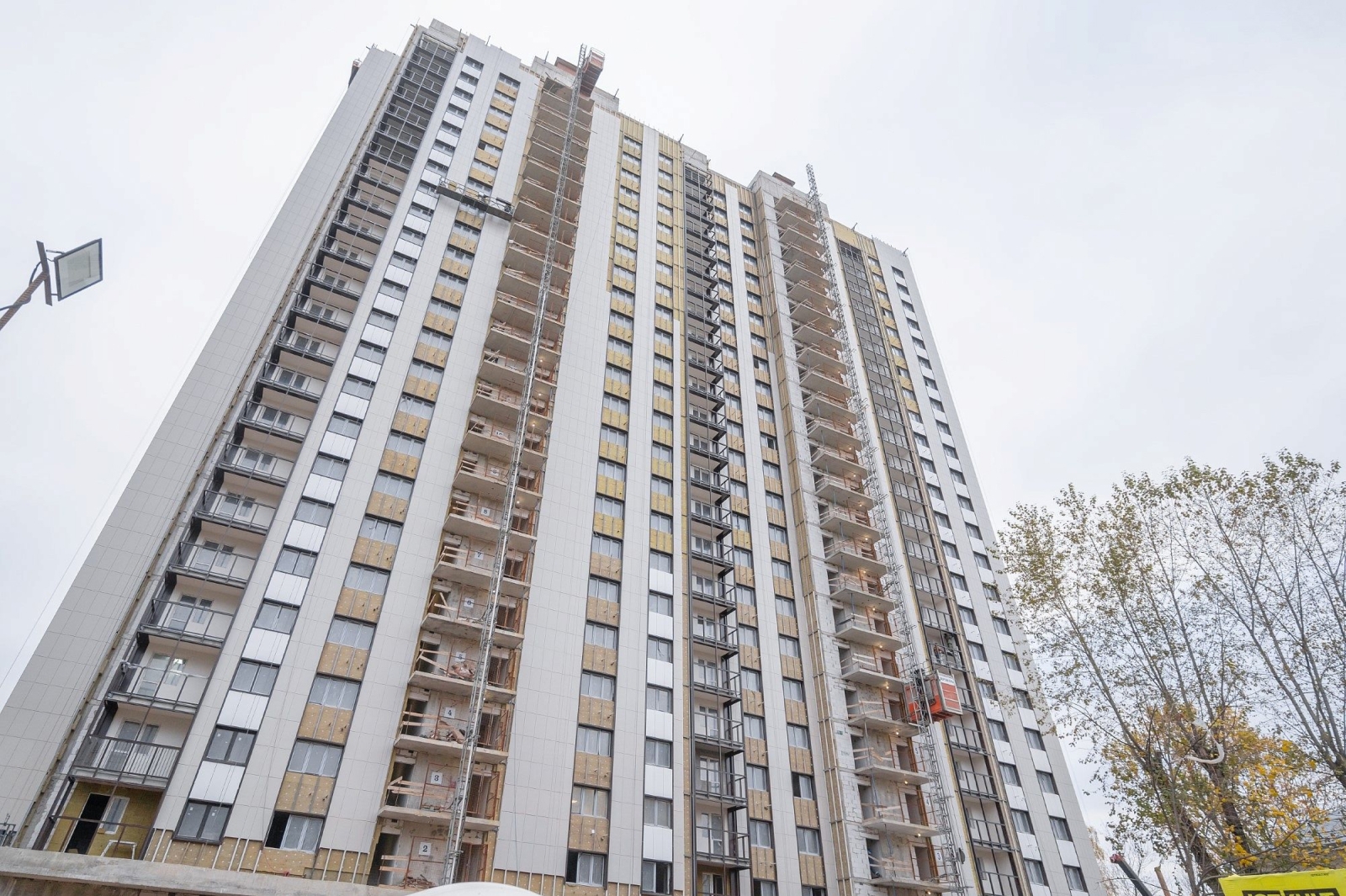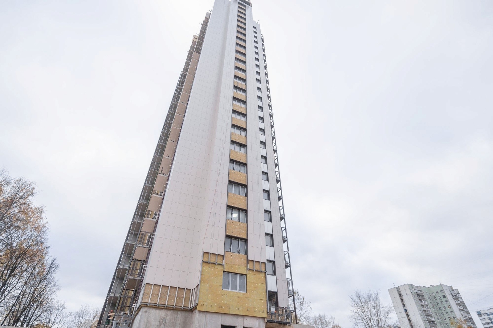 В доме по реновации в районе Лианозово монтируют фасадные панели